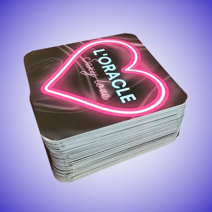 Oracle sentimental. Taille 6,5 x 6,5 cm, pelliculage brillant, 69 cartes, pas de livret des mots clés directement sur les cartes. Auto édité, conçu et imprimé en France.