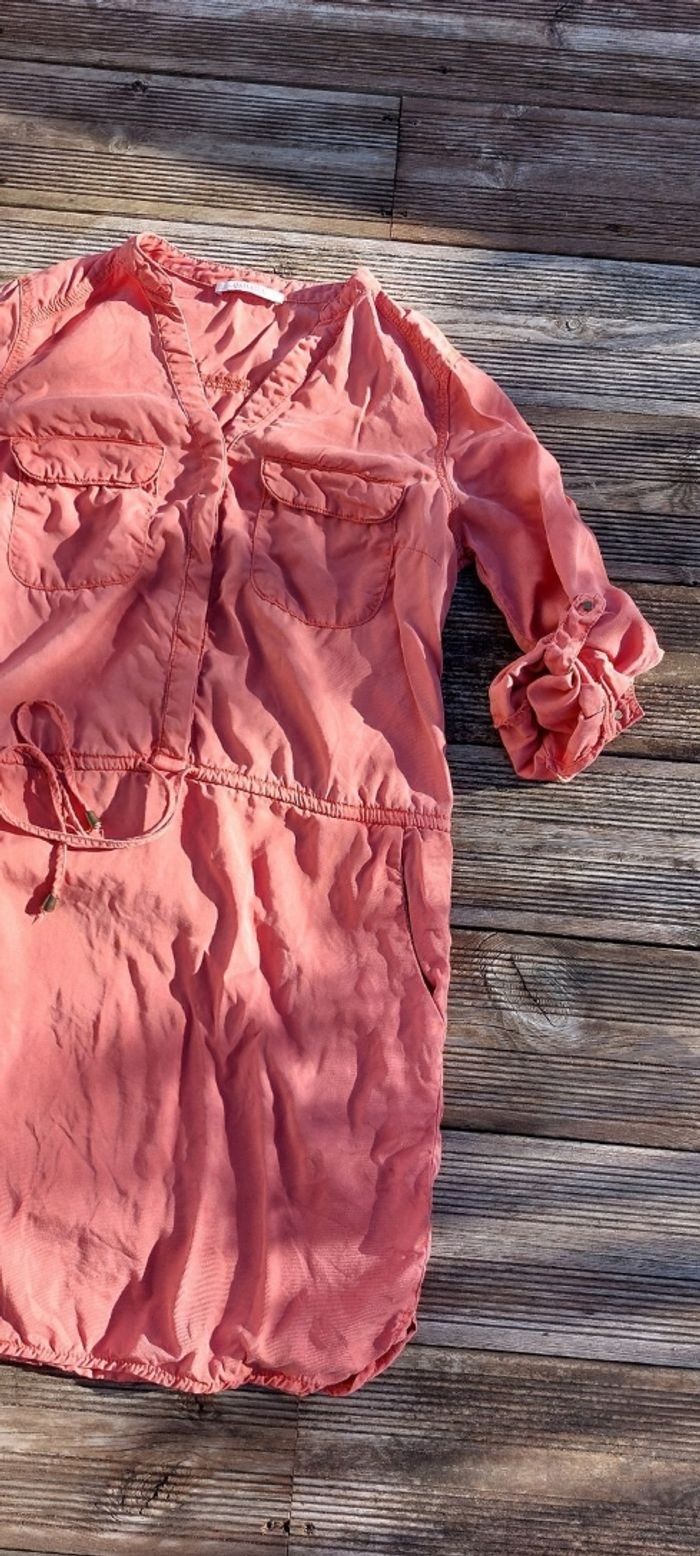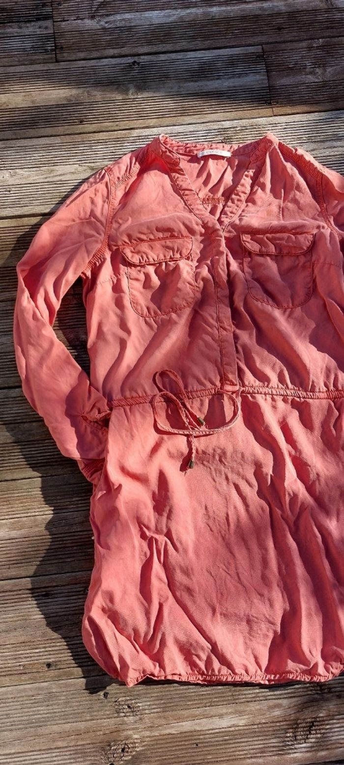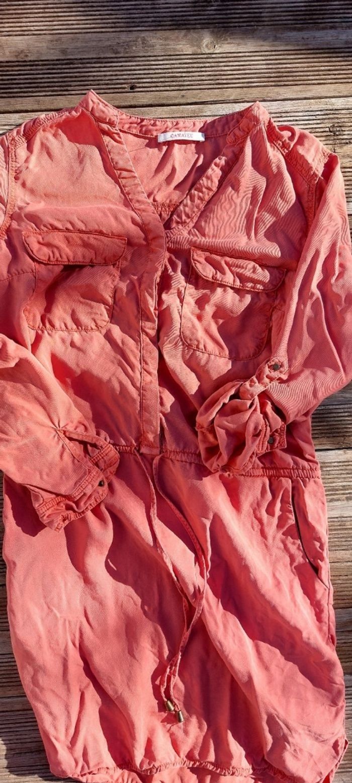 Robe casual, tunique, demi-saison Col V Manches réglables Cordon de serrage à la taille En jean souple Couleur brique #tunique #robe #demisaison #jean #L40