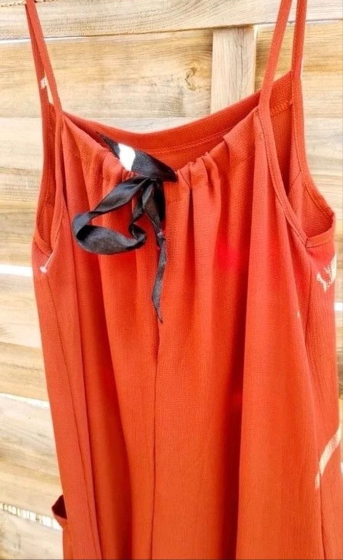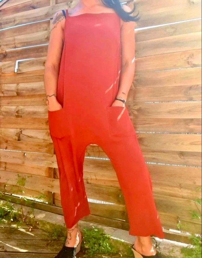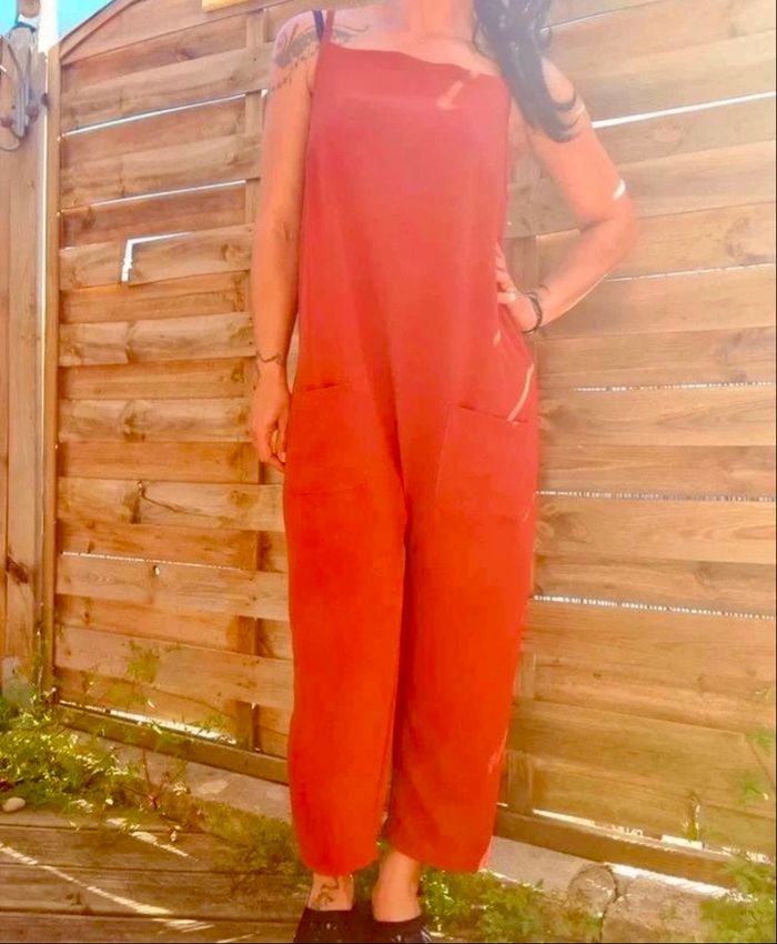 Combinaison terracotta Taille universelle Noeud ruban noir dans le dos qui permet de régler la taille des bretelles Deux poches plaquées latérales Coupe oversize