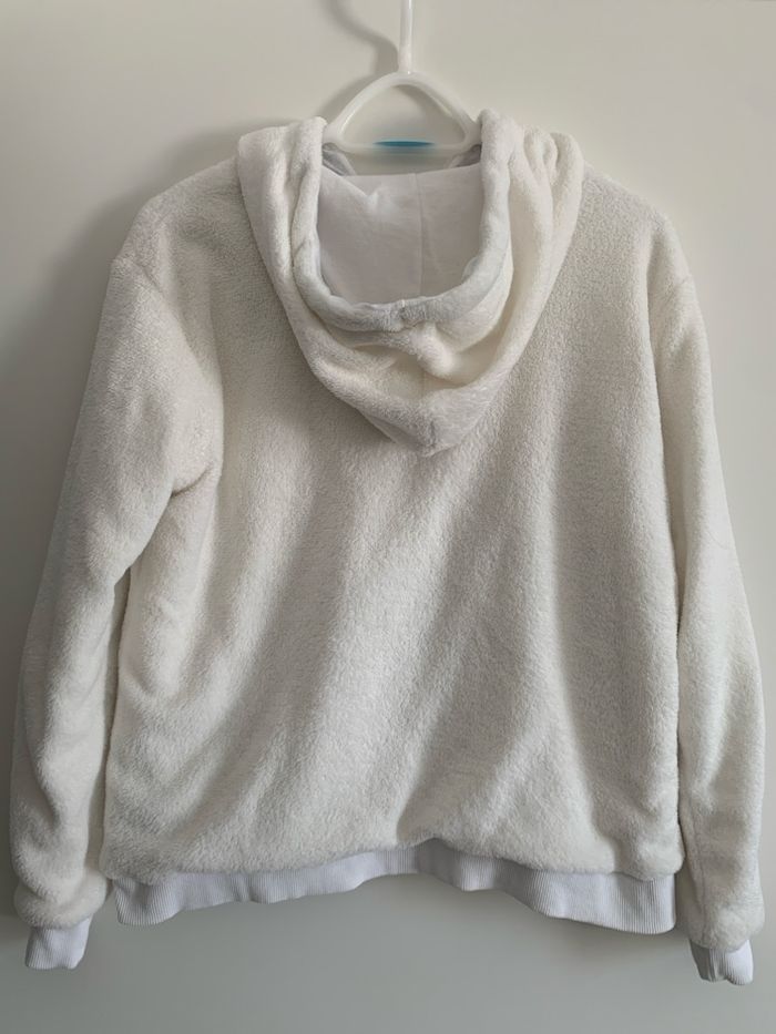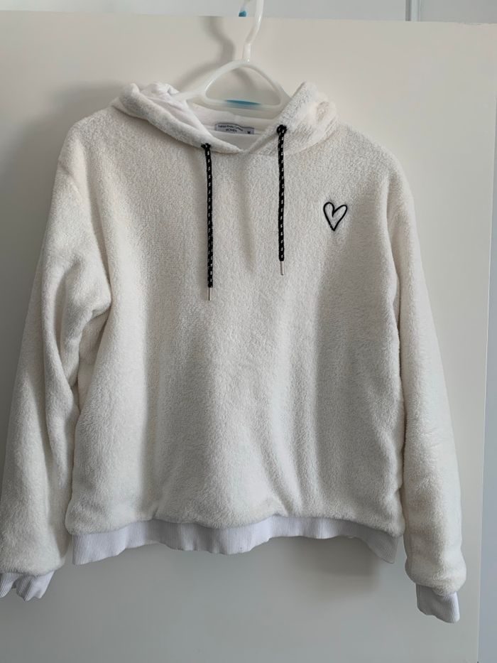 Vends sweat blanc pilou-pilou avec capuche, taille M, marque de chez Distri Center. Très bon état.