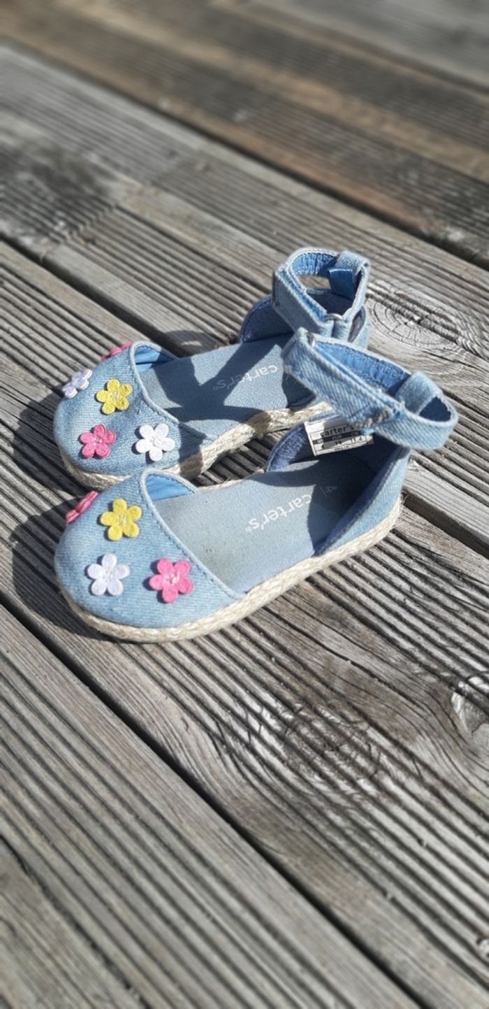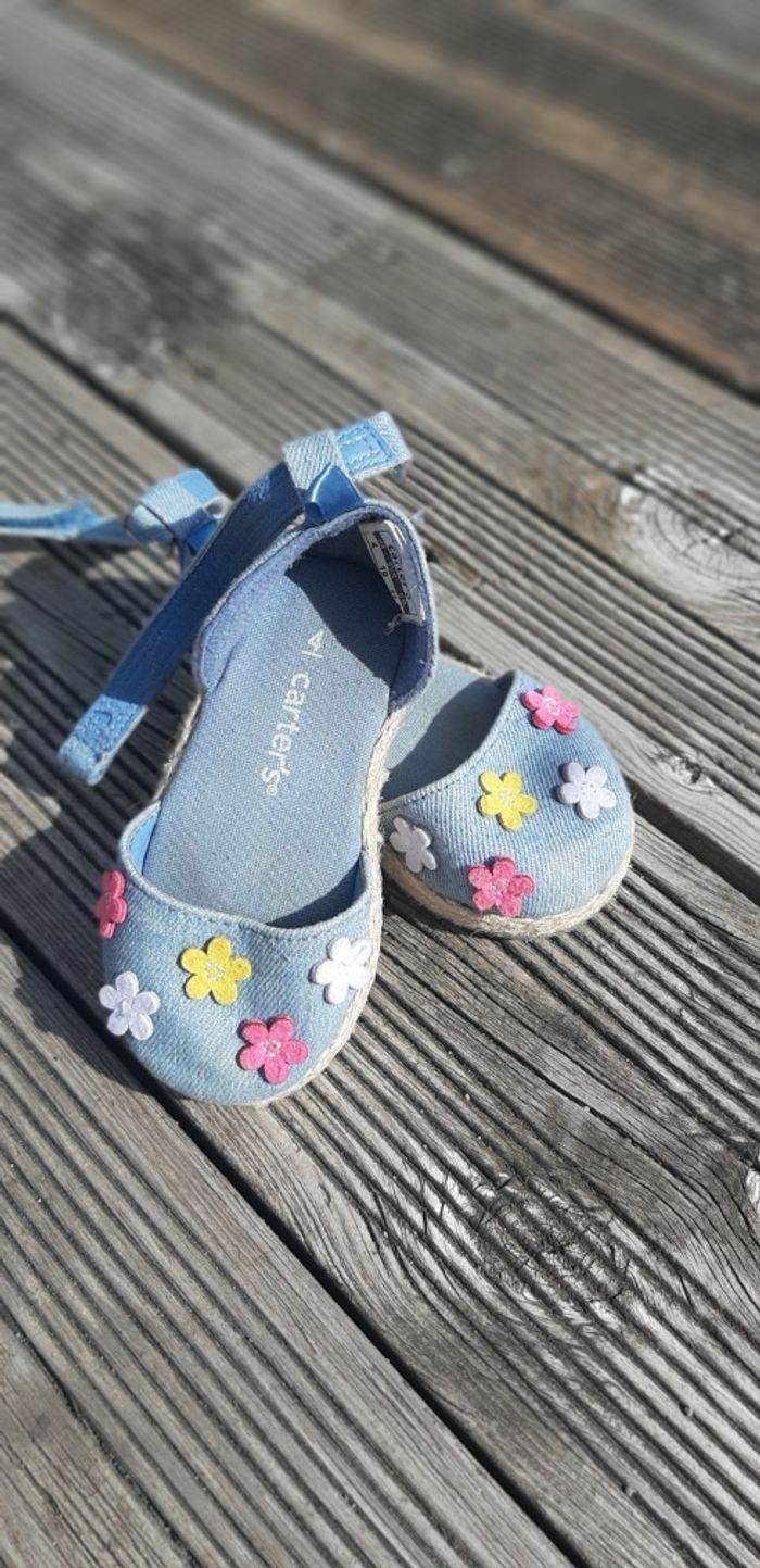 Sandales en jean bleu clair Motif fleurs multicolores Sangle en scratch à la cheville Taille 4 = taille 19 (EUR) #sandales #ete #pointure19 #jean
