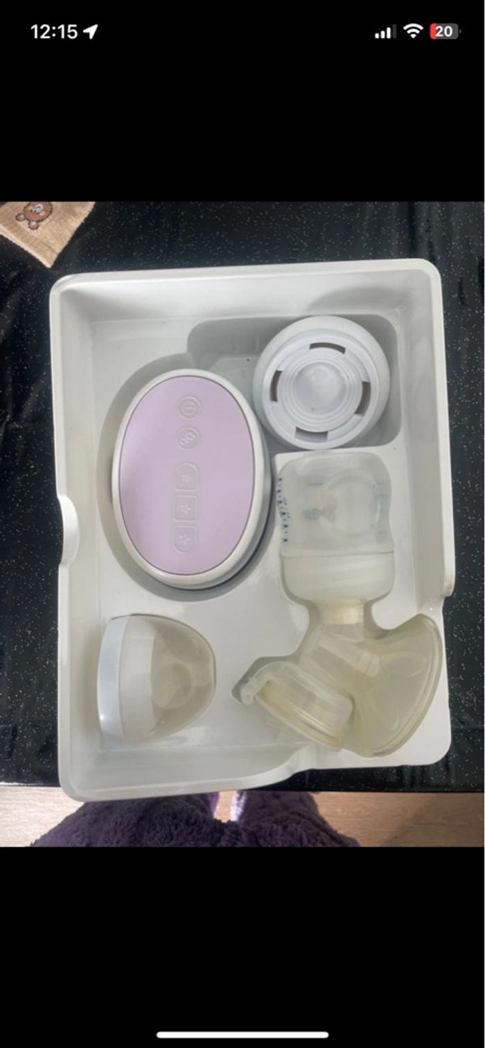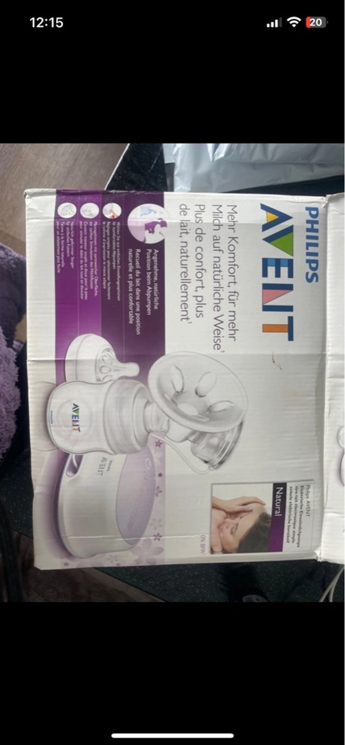 Tire lait électrique Philips Avent 1 pompe. Fonctionne parfaitement. Comprend 1 téterelle avec capuchon, accessoires nécessaires pour le fonctionnement de la pompe, base avec câble électrique, avec emplacement piles pour une utilisation nomade et le manuel d'utilisation. Inclus 2 adaptateurs pour pots de conservation Avent ou compatible biberons. Nettoyé soigneusement,