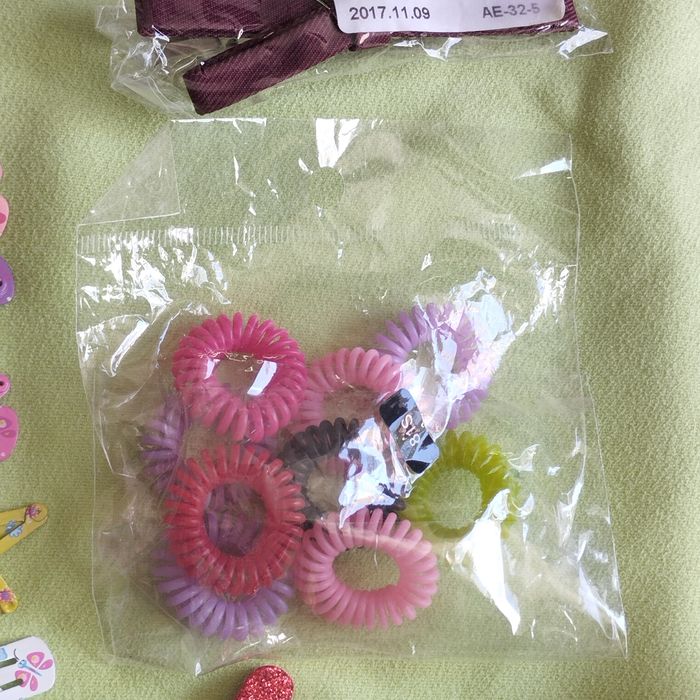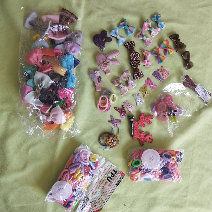 Lot de pinces pour cheveux, nœuds, barrettes , pinces clic clac, avec broderie, élastiques épais, élastiques spirale près de 250 pièces. Neuf, jamais utilisé.