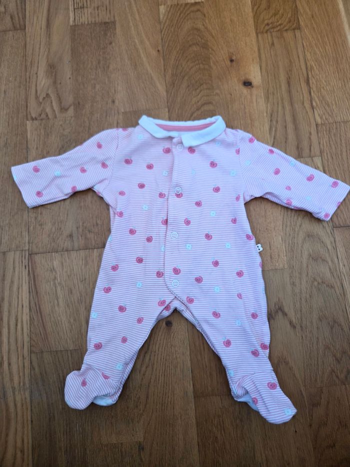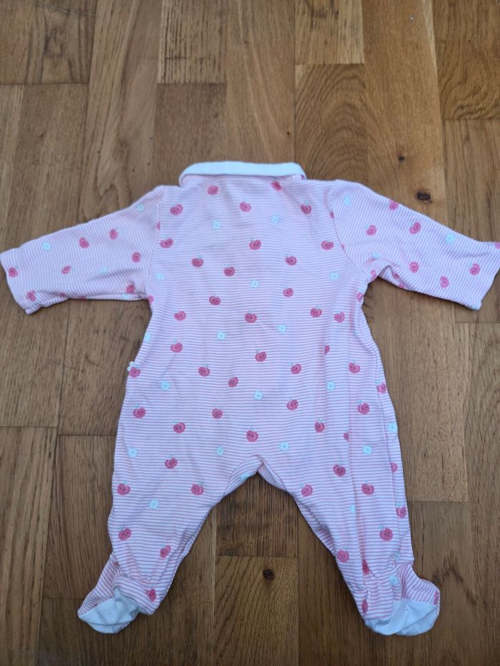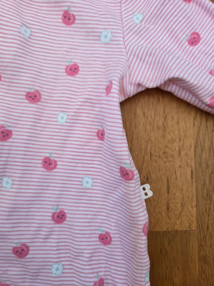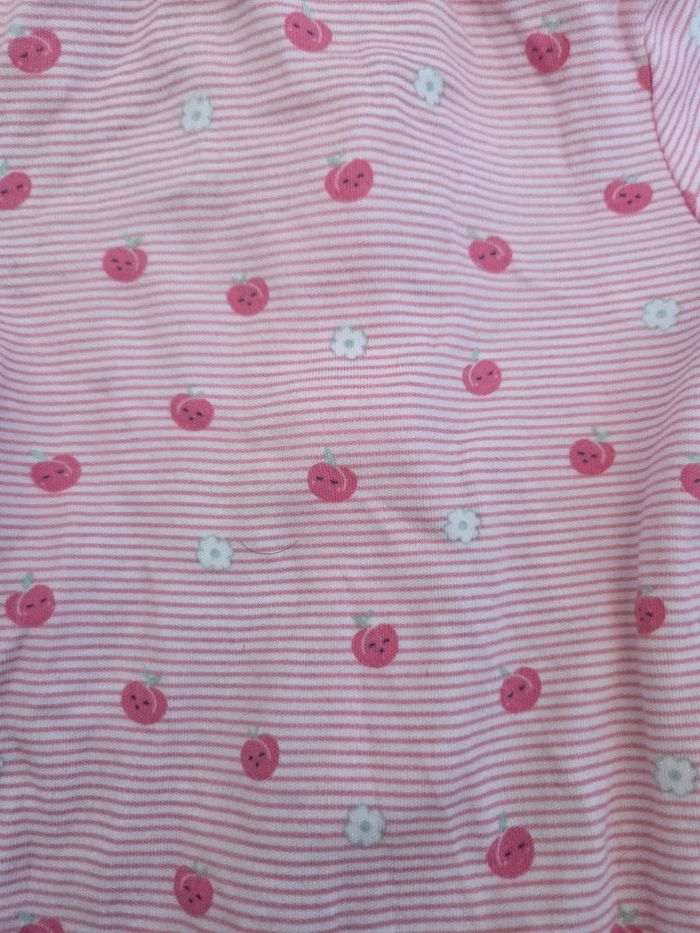Matière légère motif fruité sur fond rayé 100% des fibres de coton de ce produit sont issues coton issu de l'agriculture biologique. Motif fruité sur fond rayé col claudine PRATIQUE : Ouverture sur le devant et à l'entrejambe par pression Collection actuelle vendu 18€ en magasin