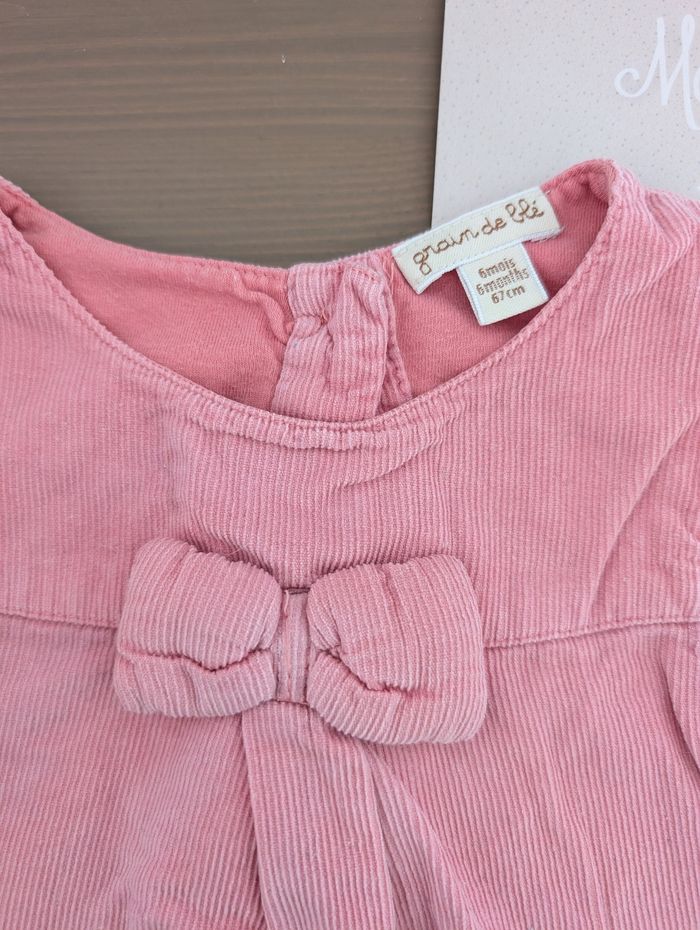 Robe sans manche en velours rose avec petit noeud sur le devant Fermeture bouton au dos Intérieur doublé coton Marque grain de blé Taille 6 mois En très bon état, pas de tâche pas de trous Maison non fumeur