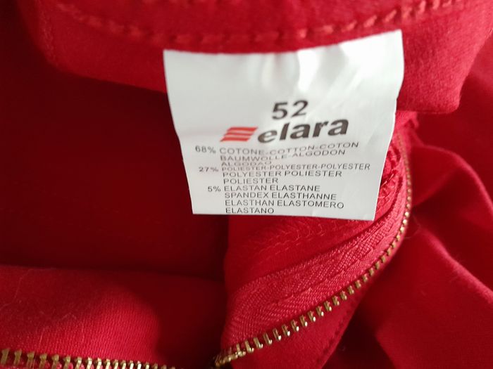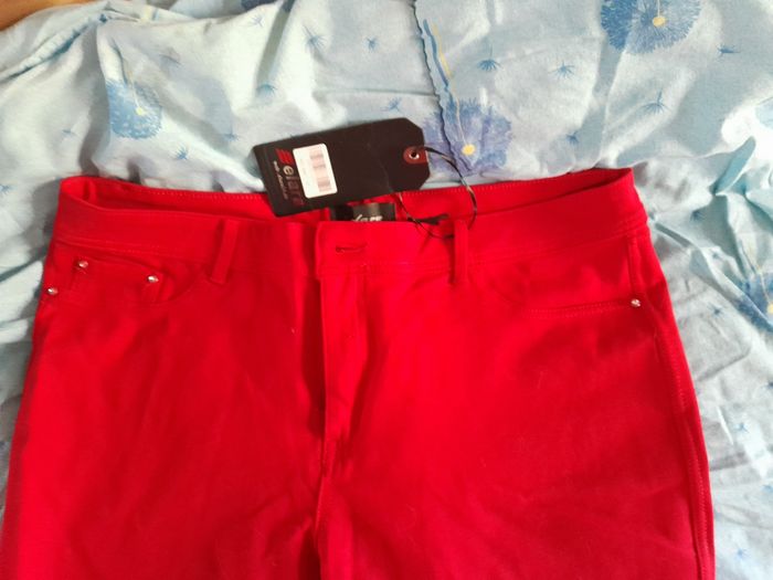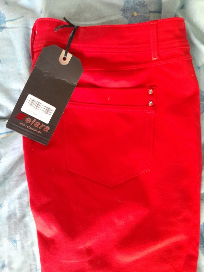 Très beau Jean taille 52 de couleur rouge elasthanne sculptant neuf avec etiquette. Tres doux au toucher. Reçu à noel mais trop grand. Lavage seul à 40 degres. Envoi rapide et soigné Voir mes autres ventes pour réduire les frais de livraison.