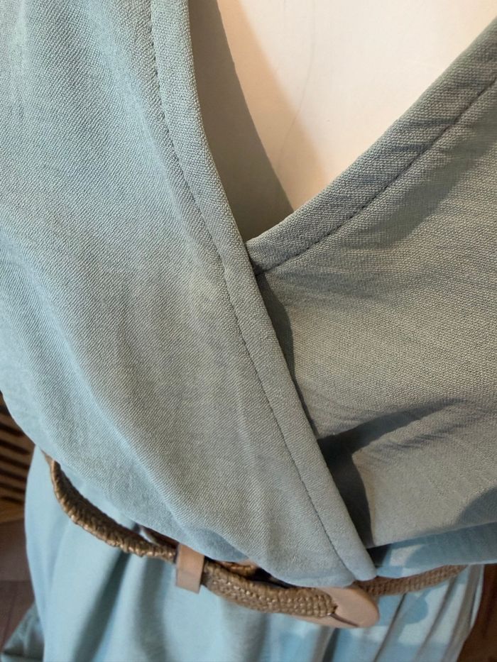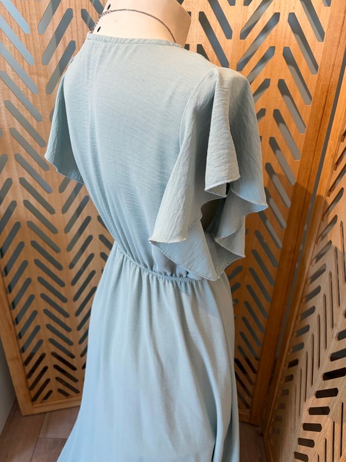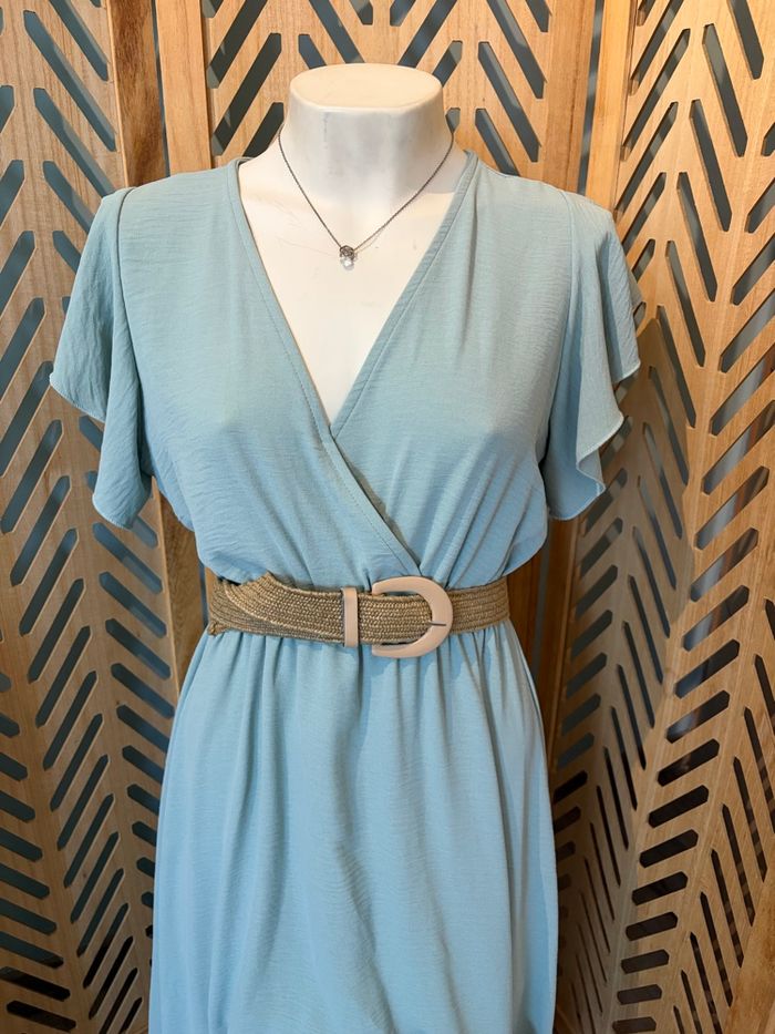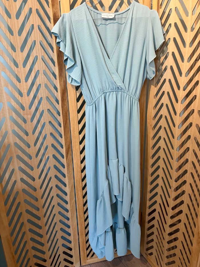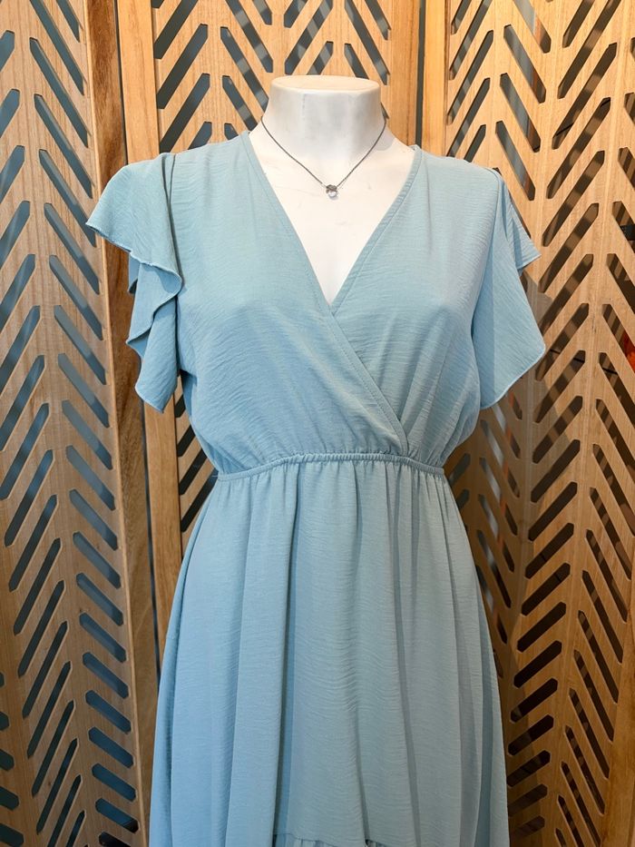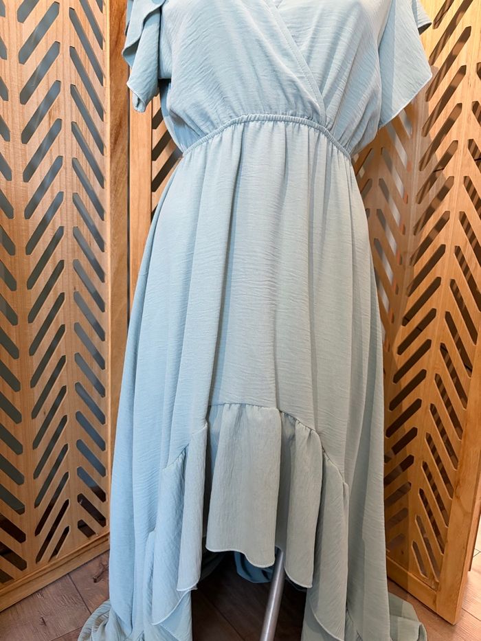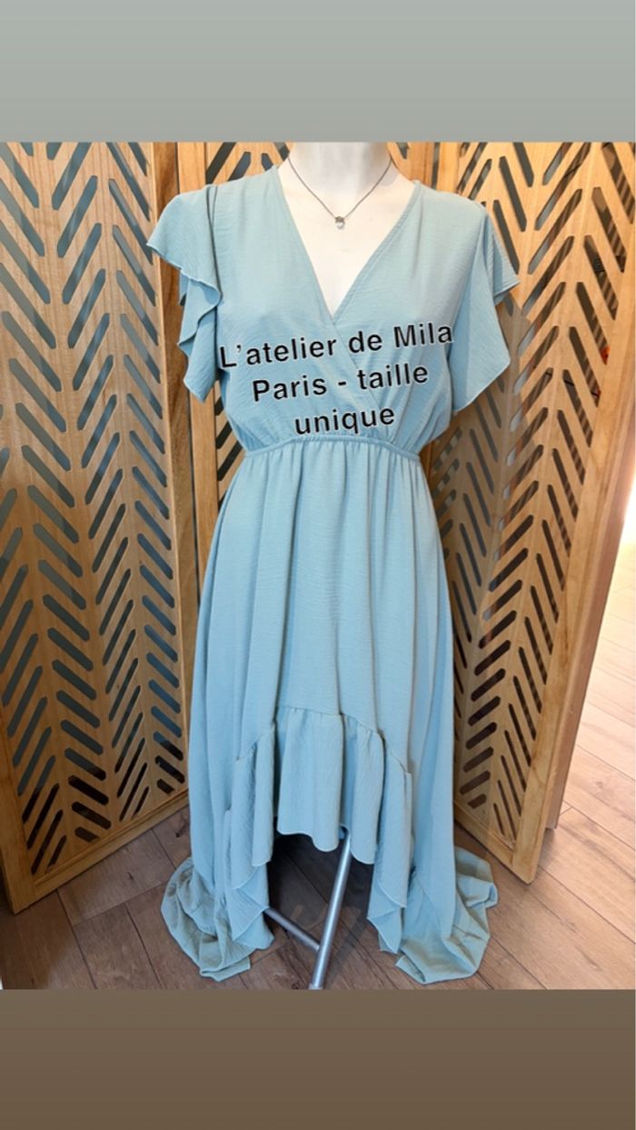 Robe L’atelier de Mila Paris – Taille unique – Très bon état Très jolie robe longue asymétrique entre un bleu pastel ou le vert sauge de la marque L’atelier de Mila Paris. Portée une seule fois pour un mariage, elle est en excellent état., j’ai fait un point de couture pour la poitrine voir photo ✨ Détails : * Taille unique (convient du S au M/L voir même XL selon morphologie) * Coupe sous poitrine fluide et légère * Décolleté en V ( point fait à la main) * Manches courtes volantées * Longueur asymétrique (plus longue à l’arrière) * Matière agréable à porter Parfaite pour une cérémonie, un mariage ou une occasion spéciale 🌿 📍 Remise en main propre possible / envoi ok 💬 N’hésitez pas à me contacter pour plus d’infos