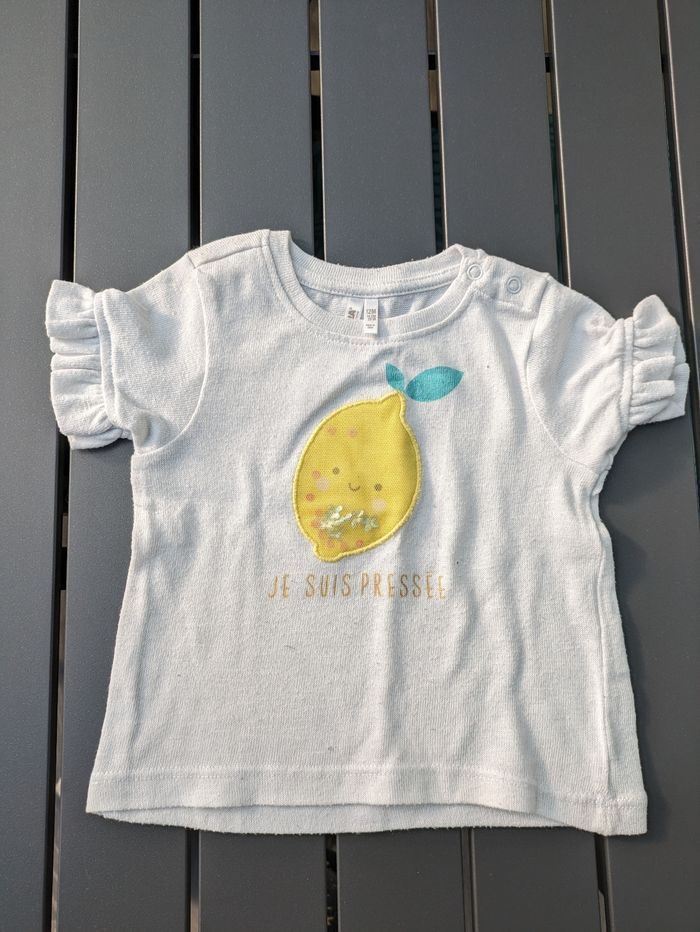 Bonjour, Je vends ce lot de 2 t shirts blanc pour fille 12 mois-1 an : Un avec motif citron et sequins et un autre à inscription "parfaite"en sequins