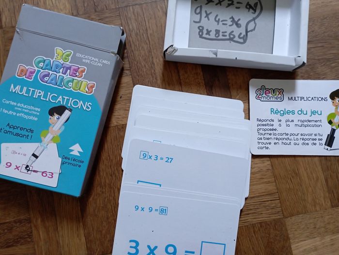 Les cartes sont utilisables des deux côtés. Le feutre effaçable n'est pas vendu avec. La boîte est un peu abîmée. Les cartes sont en bon état général mais ont déjà été utilisées. Il peut y avoir des traces dessus.