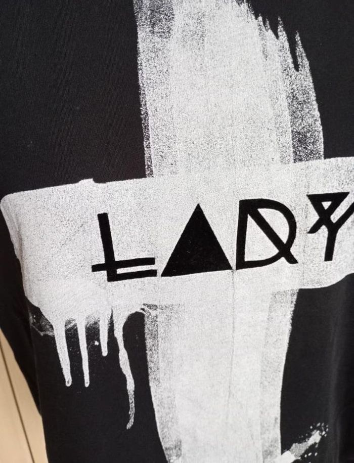 T-shirt noir avec inscription "Lady". Se porte assez large. Taille : M. Marque : Cool Cat. Longueur : 67 cm. Largeur entre aisselles : 53 cm. Très bon état.