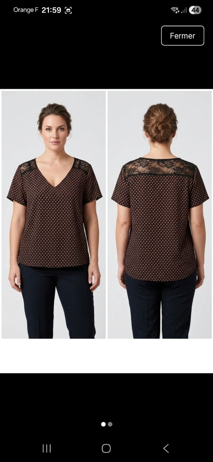 Design : Imprimé géométrique subtil (petits motifs brique/orange sur fond noir) Détails féminins : Magnifiques empiècements en dentelle noire délicate sur les épaules et le haut du dos Coupe : Encolure en V flatteuse à l'avant comme à l'arrière. Confort : Matière légère et fluide, très agréable à porter