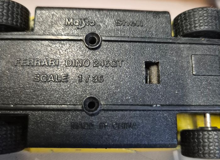 Ferrari Dino 246 GT Maisto Shell à l’échelle 1/36, modèle vintage avec portières ouvrantes et carrosserie jaune. Base marquée Maisto Shell Ferrari Dino 246GT Scale 1/36 Made in China. Voiture complète avec traces d’usure et éclats de peinture visibles, typiques d’un modèle joué. Vendu tel que présenté sur les photos. #maisto #shell #ferrari #dino246gt #voitureminiature #diecast #collection