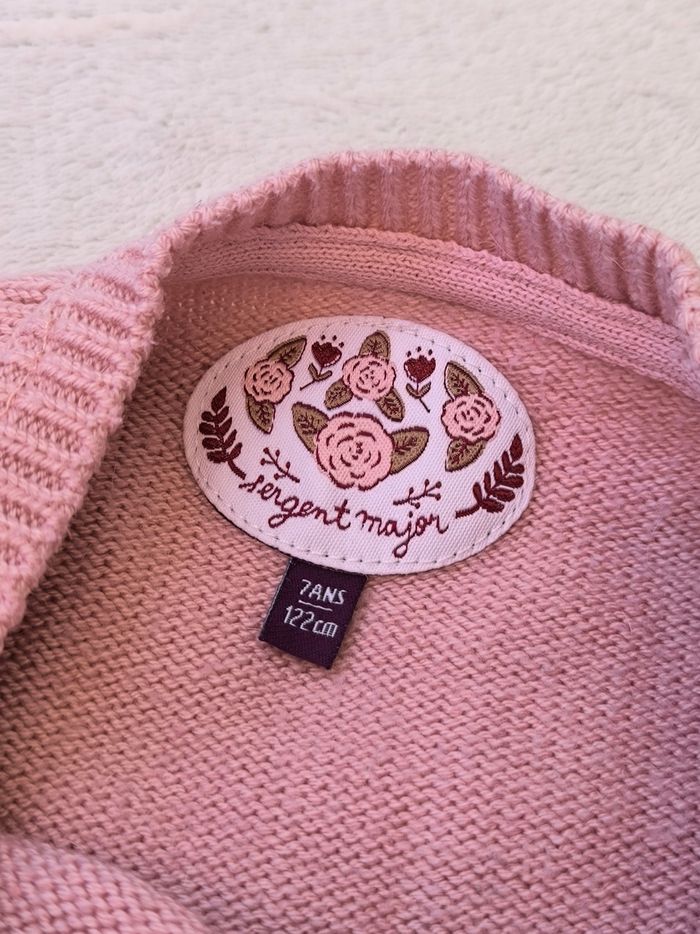 Gilet à manches longues Marque Sergent Major Taille 7 ans, 122 cm • Coloris rose • Patch tête de renard, broderie cœur • Fermeture par boutons • Mailles En très bon état #evelyne_filles_7ans #evelyne_filles