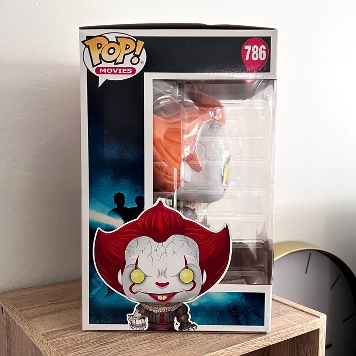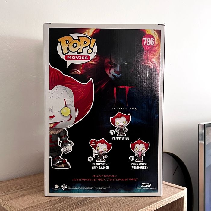 Figurine Funko Pop officielle Version Jumbo mesurant 25cm. Figurine neuve, elle n’a jamais été sortie de sa boîte. IT Chapter 2 Pennywise #786
