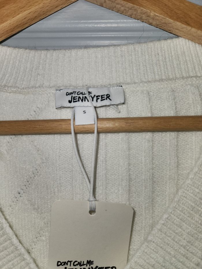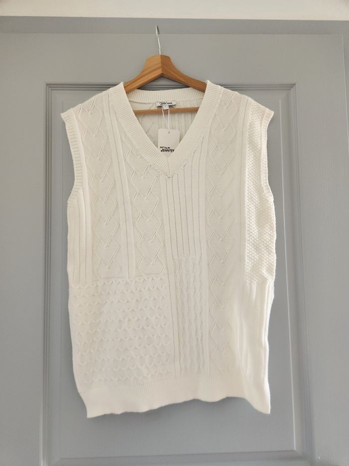 Je vends un pull sans manches de la marque Jennyfer. Idéal pour la mi-saison ou à superposer sur une chemise ou un t-shirt pour un look tendance ✨ • Marque : Jennyfer (Don't call me Jennyfer) • Type : Pull sans manches • Col : Col V • État : Neuf avec étiquette • Taille : S • Couleur : blanc crème Matière agréable à porter, coupe moderne 📦 Envoi rapide 💬 N’hésite pas à me contacter pour plus d’infos ou de photos
