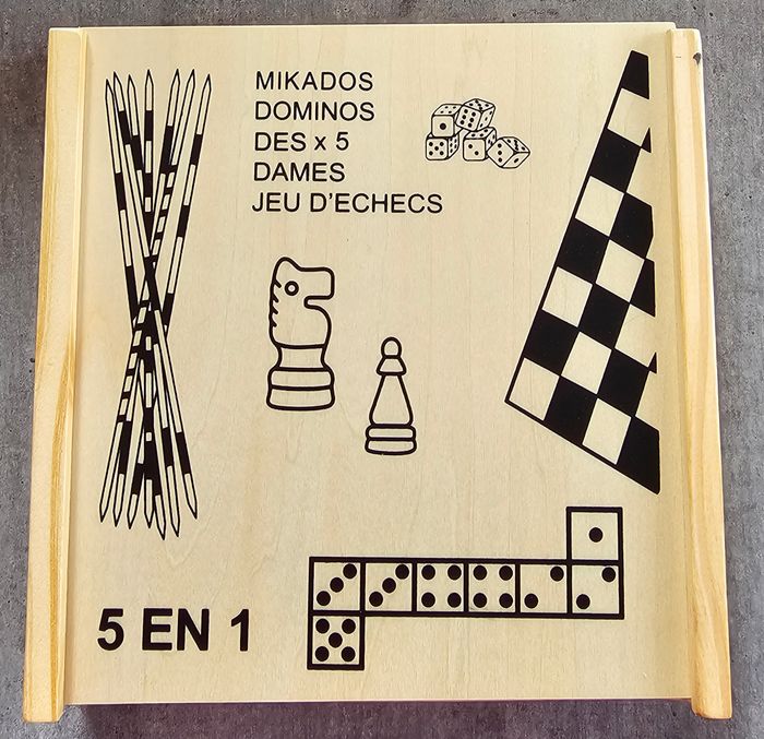 Mikados, Dominos, 5 Dés, Dames, Echecs Taille de la mallette : 20 cm X 20 cm X 4 cm Etat neuf, jamais utilisé