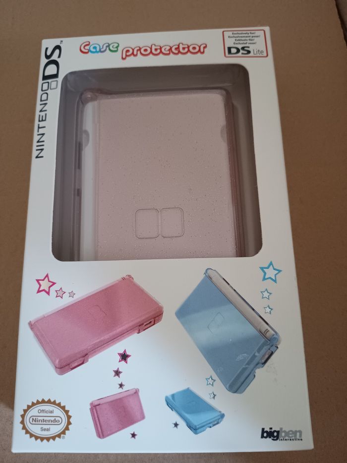 coque de protection (“case protector”) pour Nintendo DS Lite. ✨ Couleur : rose pailleté (effet brillant) ✔️ Protège la console contre les rayures et chocs ✔️ Coque rigide transparente teintée ✔️ Accès à tous les boutons et ports 📦 État : neuf (dans l’emballage d’origine) 🏷️ Marque : Bigben Interactive 🔒 Produit avec sceau officiel Nintendo Parfait pour personnaliser et protéger ta DS Lite !