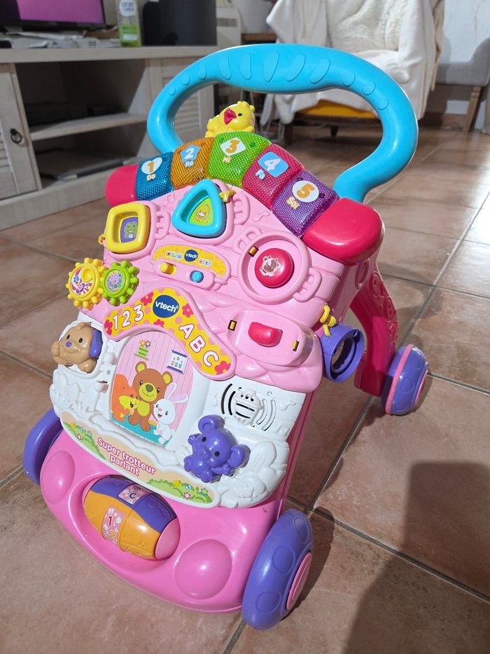 Un super trotteur 2 en 1 pour faire ses premiers pas ! Le Super trotteur parlant accompagne Bébé dans ses premiers apprentissages. Très bon état