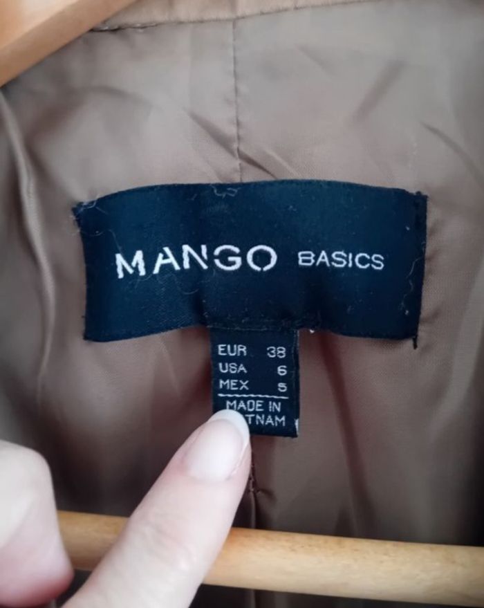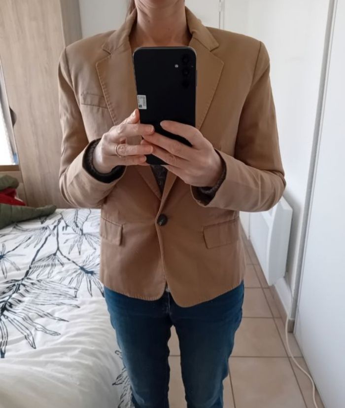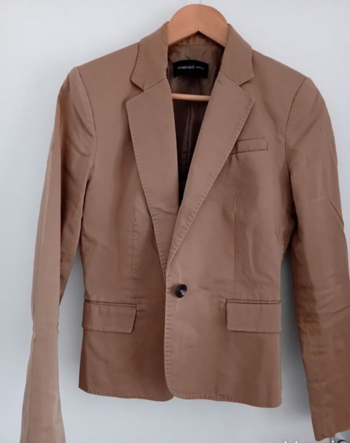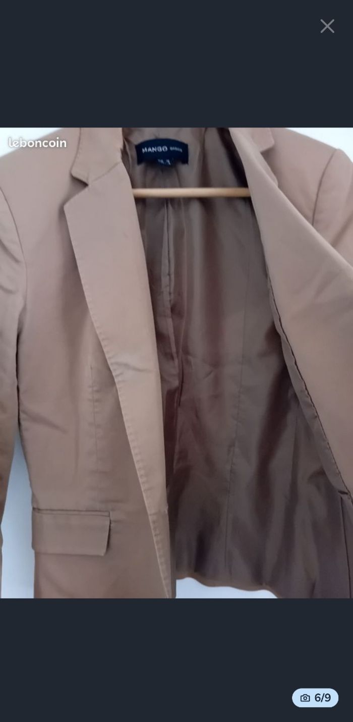 Vends un blazer taille 38, marque Mango, très bon état. Épaulettes. Ferme par un bouton. 2 poches trompe-l'oeil. 1 petite tâche en bas de l'épaule et 1 sur le derrière d'1 bas de manche, voir photos.