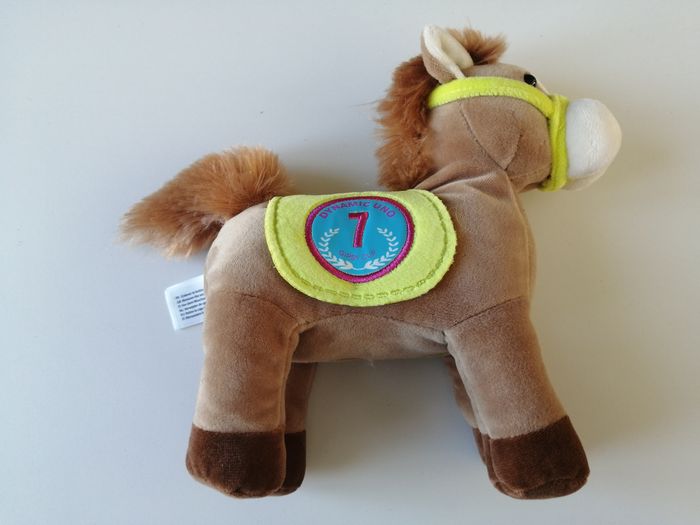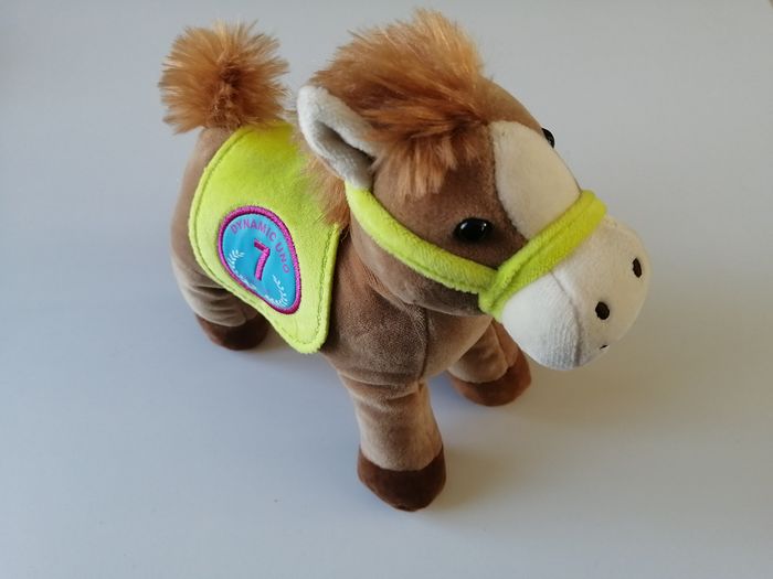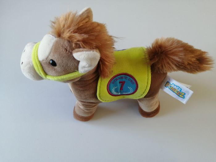 peluche cheval / poney dynamic uno N° 7 fonctionne à piles fournies le boîtier peut se retirer en appuyant sur les flancs une sonnette tinte puis son du hennissement et galop race poneez gipsy toys 20 cm