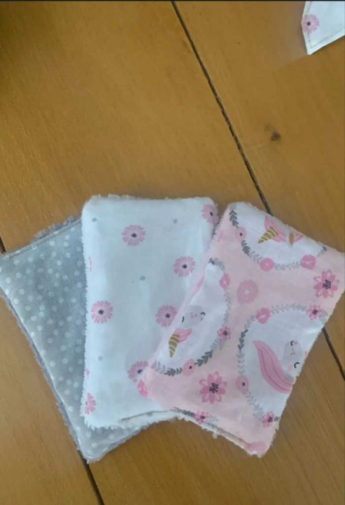 Vends un superbe ensemble assorti au motif fleuri / licorne , idéal pour le change ou la toilette de bébé. • Trousse matelassée : Belle tenue et grand volume. • Dimensions : L 20 cm x l 10 cm x H 12 cm. • 3 Lingettes lavables : Une face coton imprimé et une face éponge ultra douce pour la peau. • État : Neuf. Parfait pour glisser dans le sac à langer ou pour un cadeau de naissance original et éco-responsable !