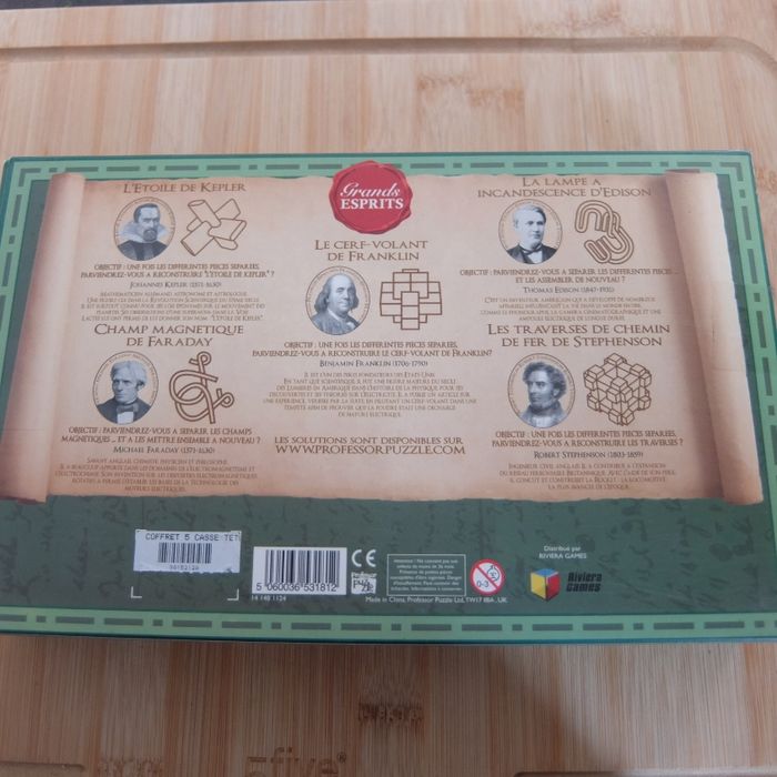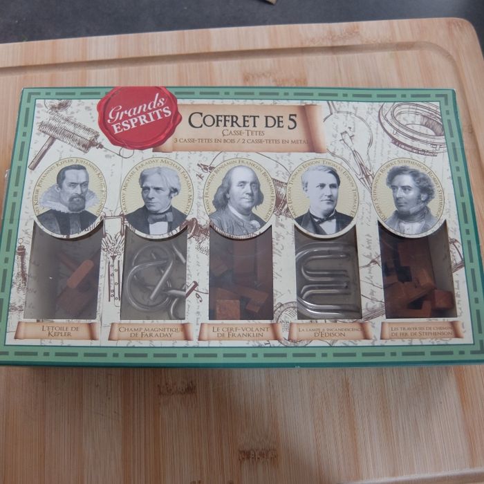 Coffret 5 casse-têtes Casse-têtes en bois et en métal 5 modèles différents: Kepler, Faraday, Franklin, Edison et Stephenson. Distribué par Nature et Découvertes A partir de 8 ans Essayé une fois mais pas intéressé Marque Riviera Games
