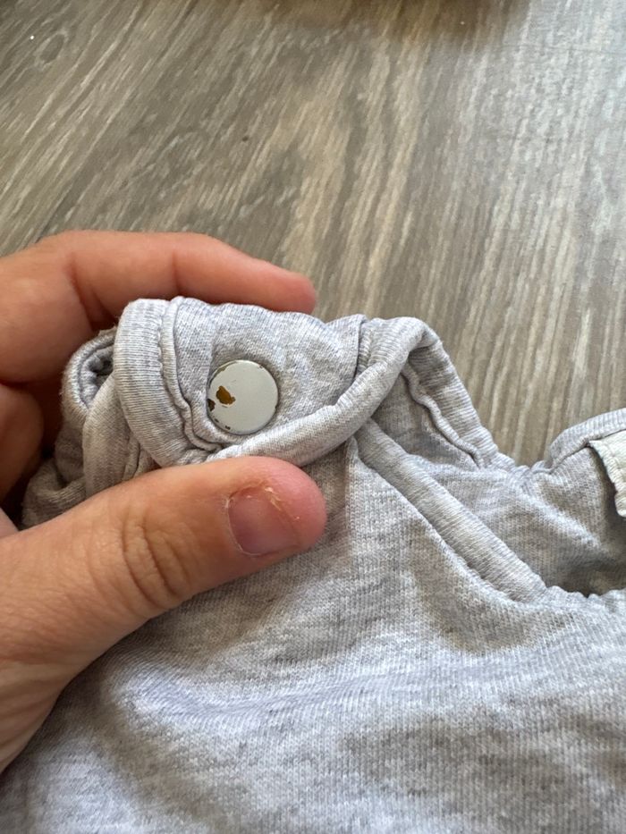 Gigoteuse Mickey, de la taille 0 à 3 mois. Avec des manches qui se retirent. Et un réglage en hauteur avec des pressions. Les boutons pression de couleur sont un peu abîmées. La peinture c’est retiré. Voir sur les photos.