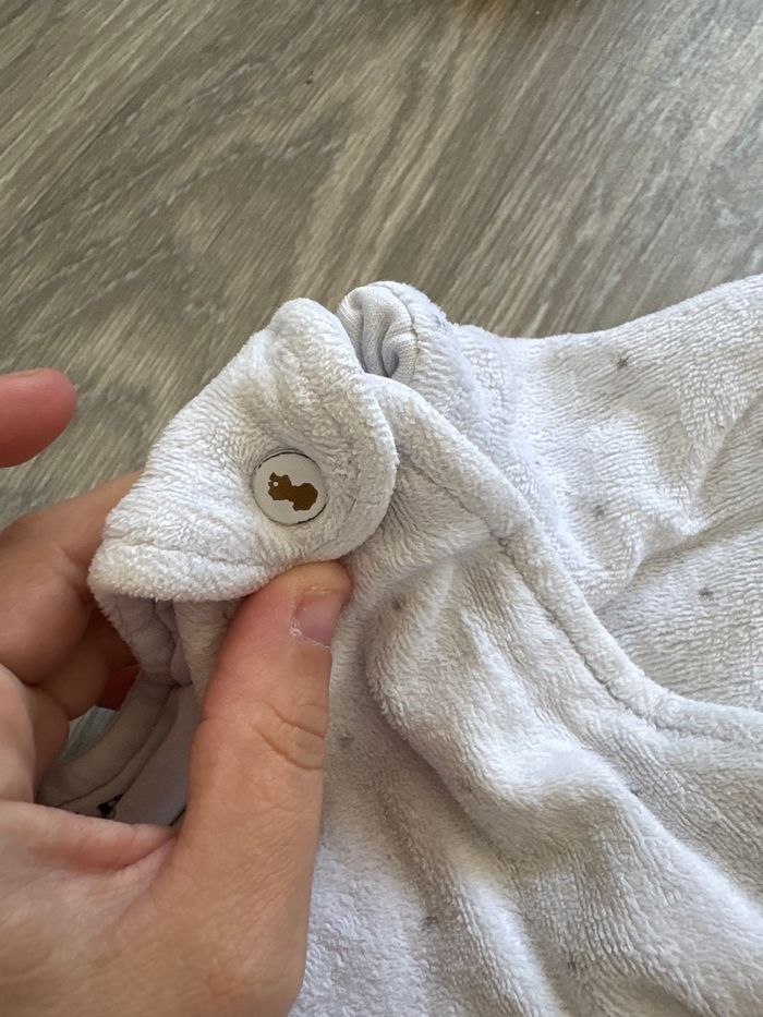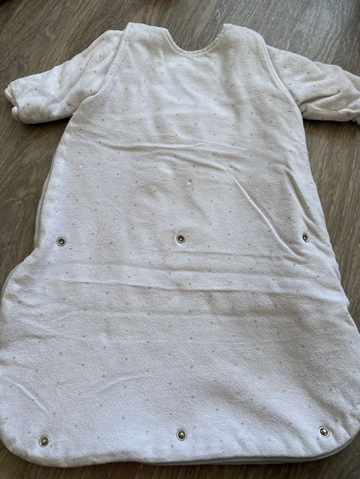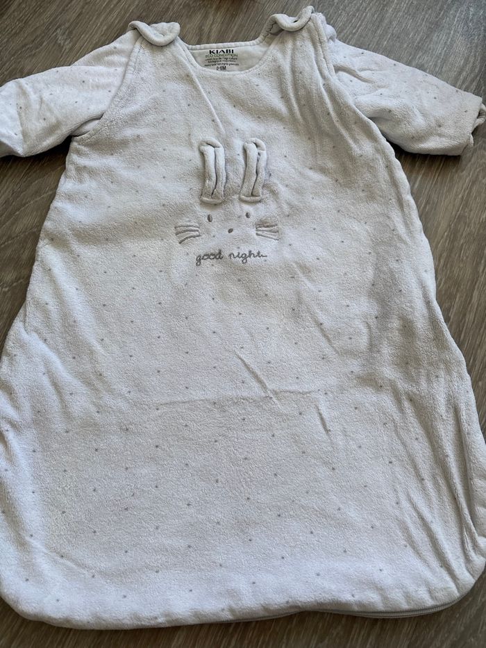 Gigoteuse, lapin, blanc de la marque Kiabi, de taille zéro à six mois. Manche amovible par des pressions. Les pressions métallisées de couleur sont un peu abîmées. Voir sur les photos.