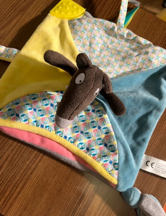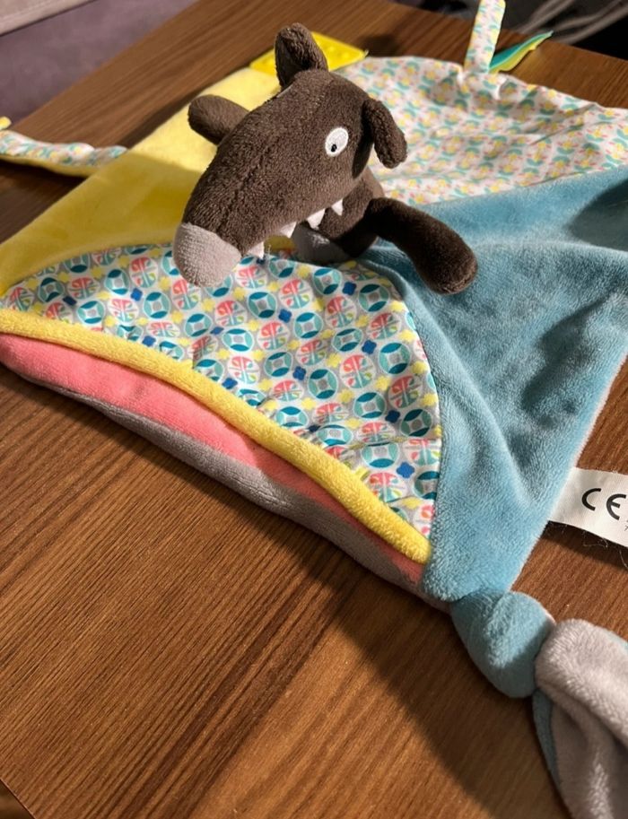 Mon doudou p'tit loup petit loup peluche bébé marque Auzou. Au cas où bébé a perdu son doudou ! Il est très doux, a une partie dure dans un coin à mordre, et un petit lien avec bouton pour l'attacher à la poussette ou autre. Tête marron, tissu jaune et une autre partie avec motifs multicolore.
