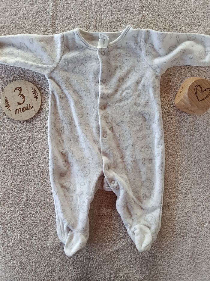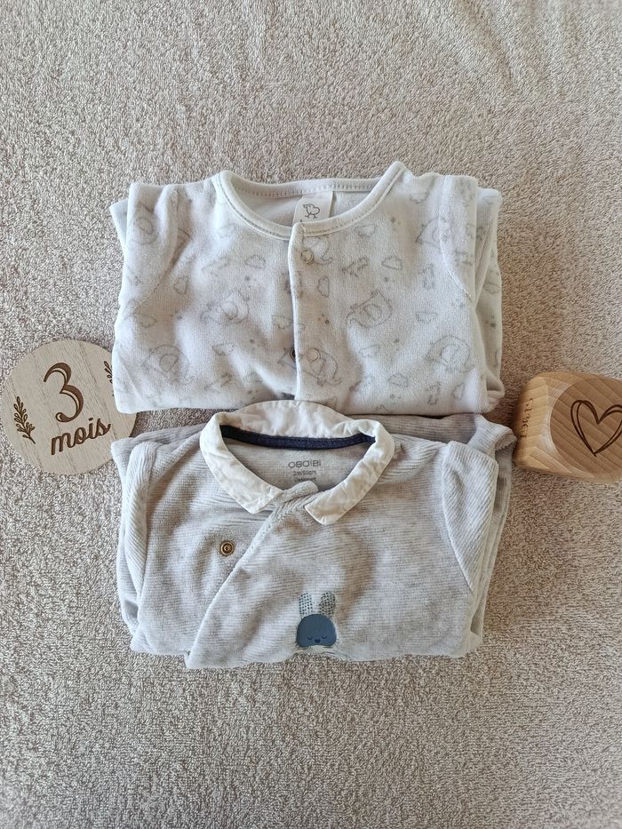 Lot de 2 pyjamas en taille 3 mois, ouverture par le devant. Marque : baby club et obaïbi.
