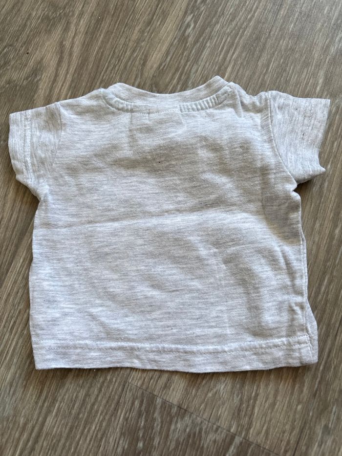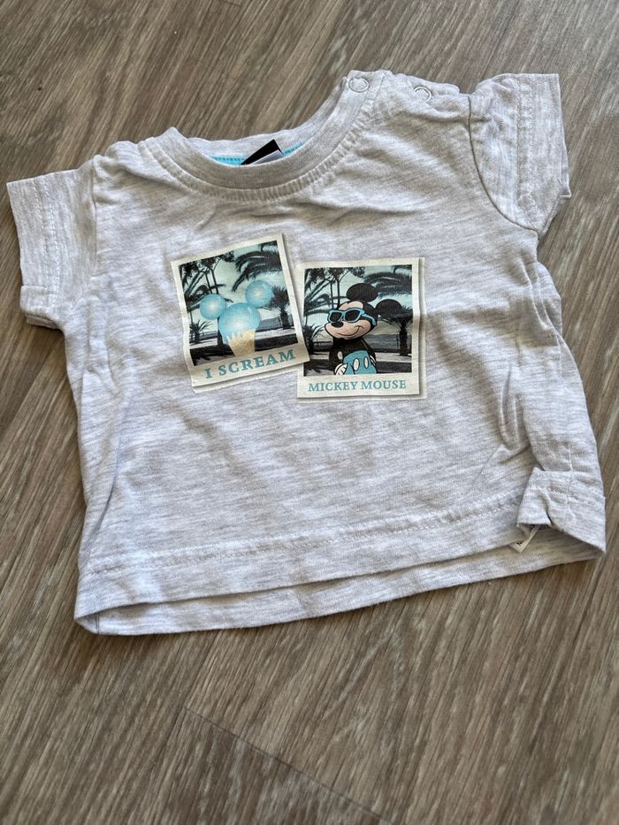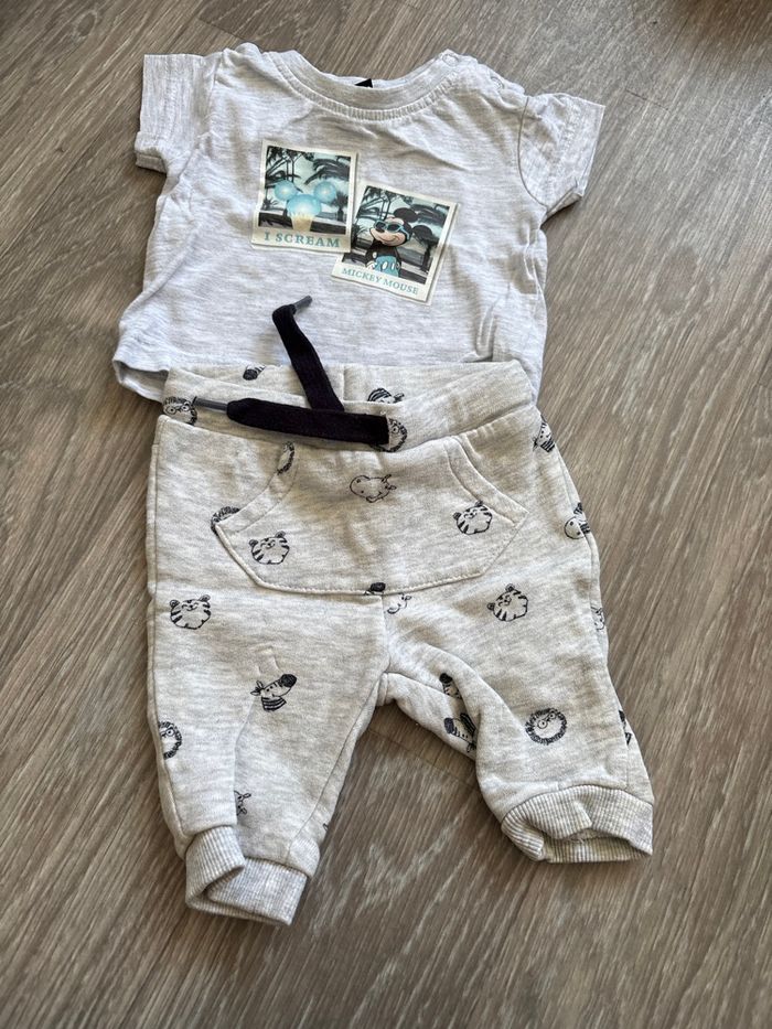 Ensemble de taille naissance à un mois. Un T-shirt manches courtes et un pantalon de couleur grise. - le T-shirt de la marque Disney Baby, de couleur grise avec Mickey dessus taille 50 cm - le pantalon de la marque Kiabi, de la taille, un mois, de couleur grise, avec des lanières bleu marine et des petits dessins.