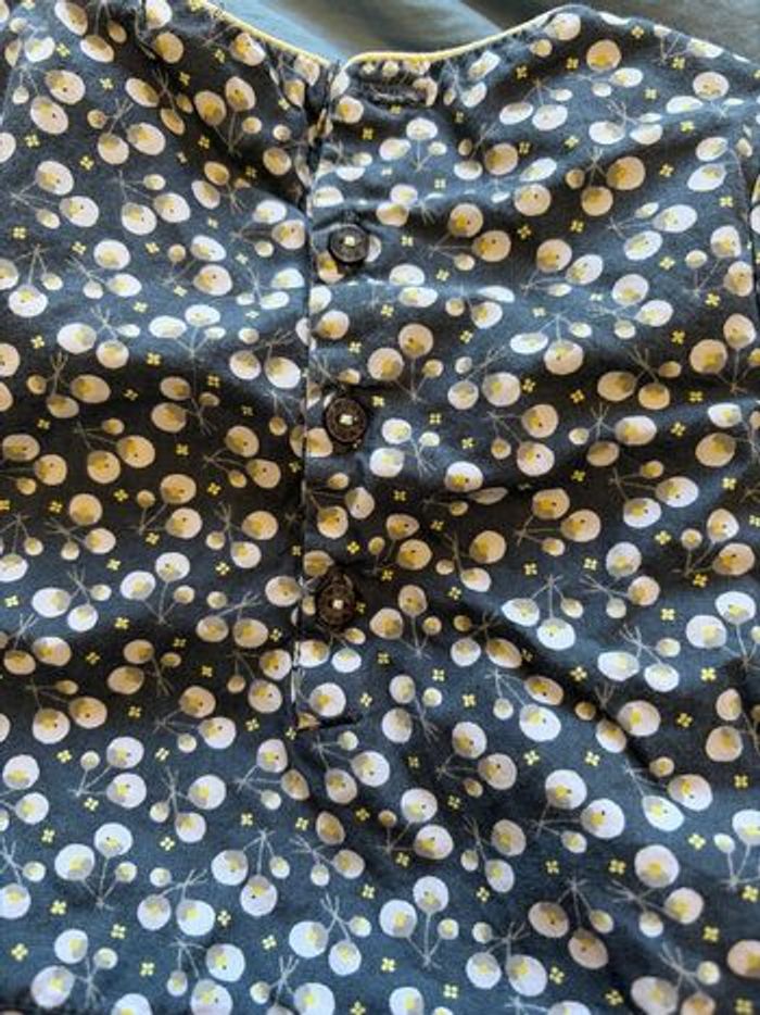 Ce ferme à l’arrière avec des boutons, resserrer à l’aide d’élastique aux manches Plus d’étiquette de composition