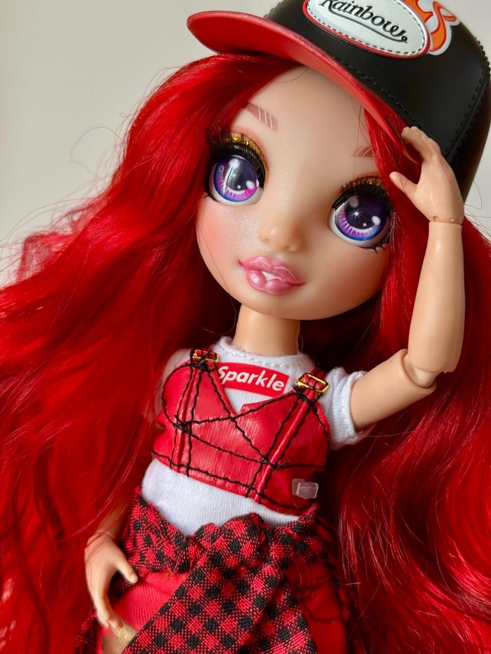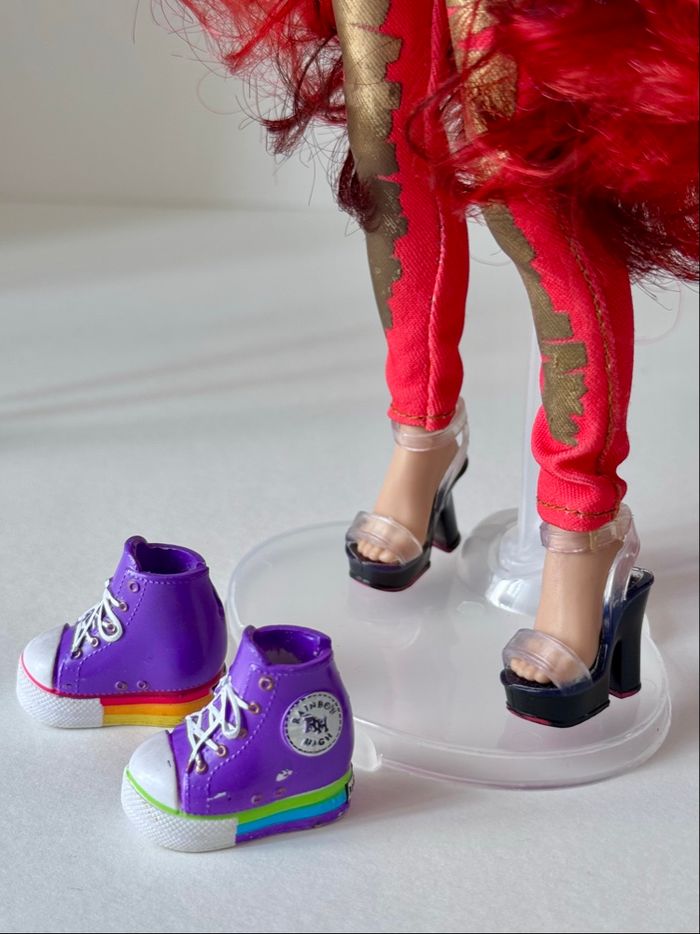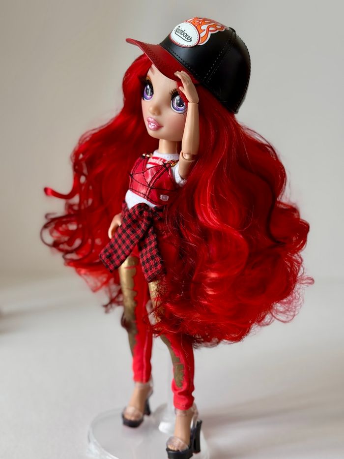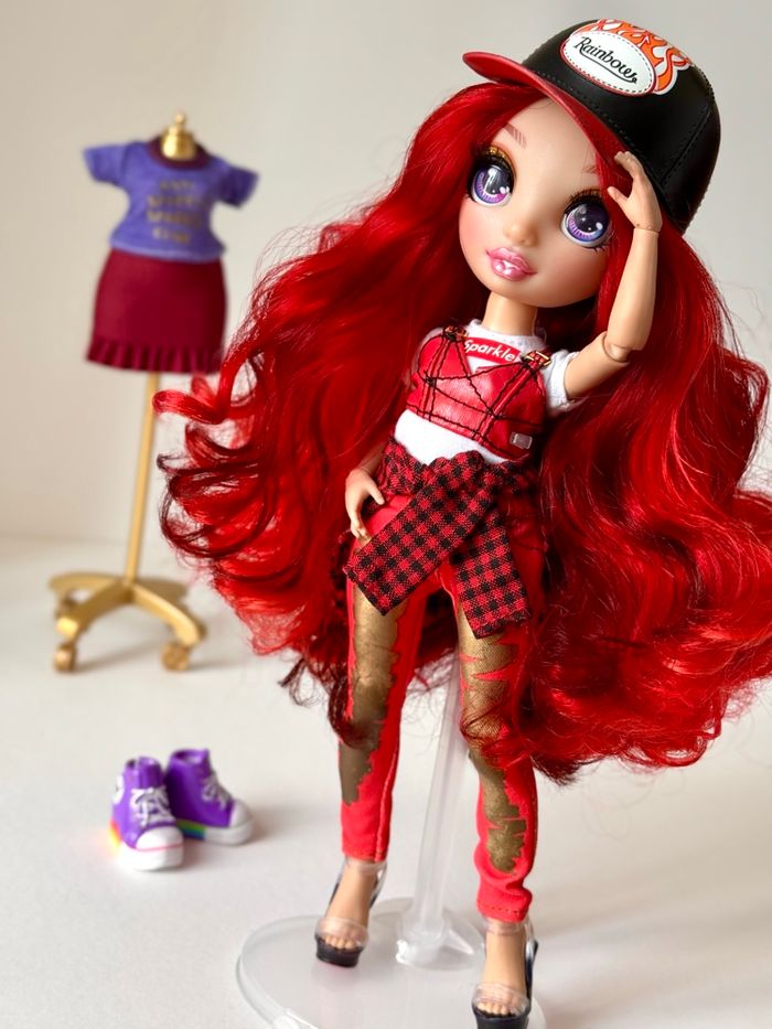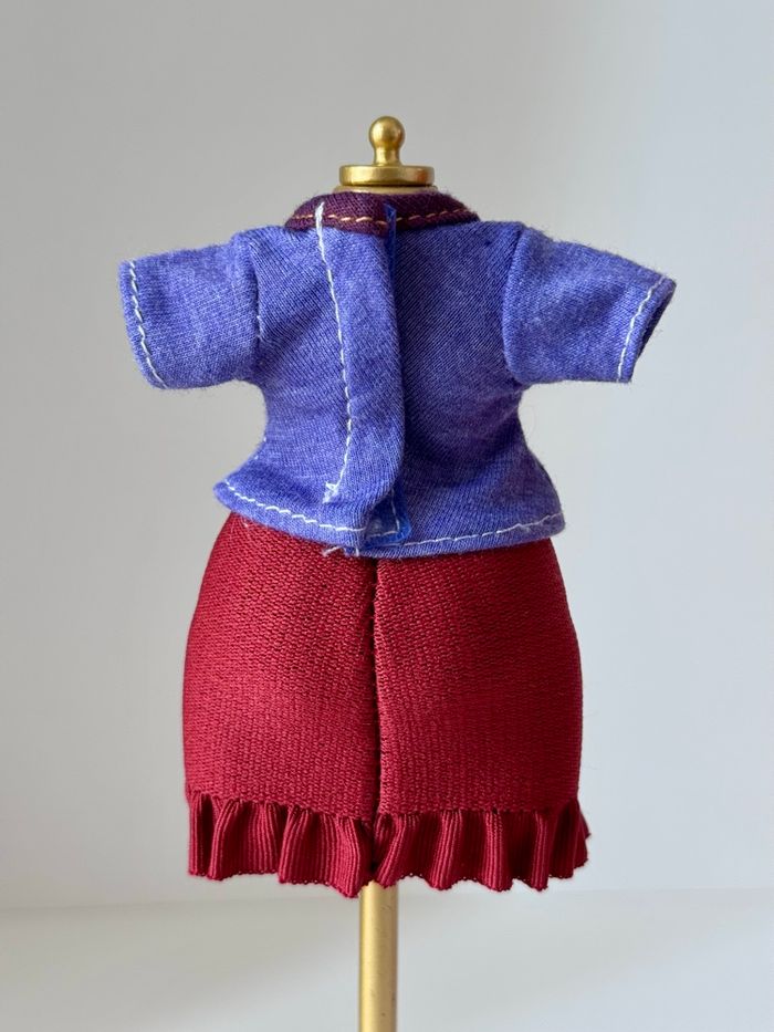 Le portant à vêtement présente la deuxième tenue, il n’est pas inclus. Occasion en très bon état. Le t-shirt a été teint, la jupe est faite à la main. Des mèches ont été teintes en noir dans les cheveux de la poupée.le socle est inclus. Maison non fumeur, envoi rapide et soigné.