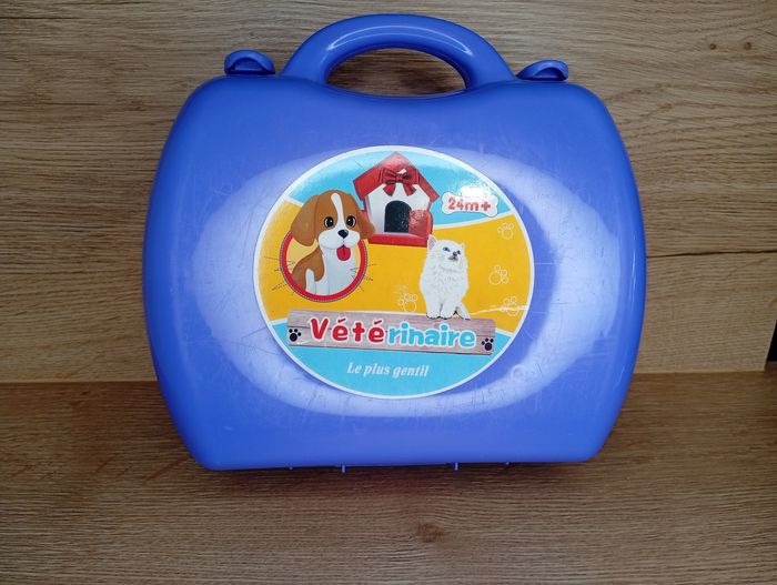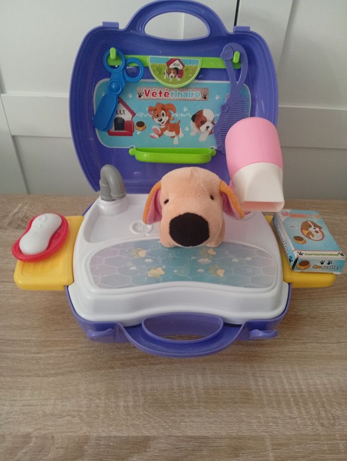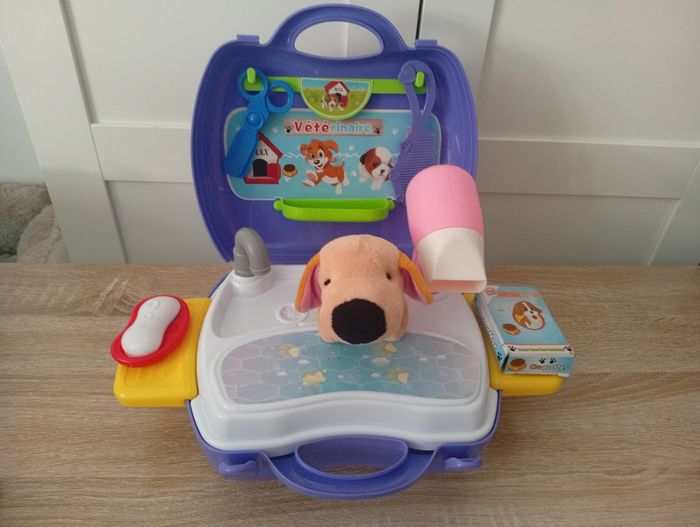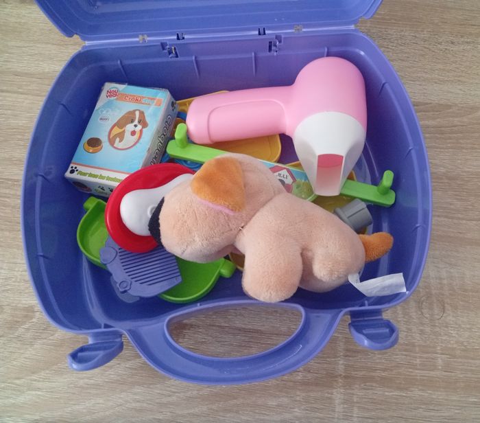 Je vends cette malette de toiletteur/toiletteuse "Vétérinaire" en bleu, parfait pour les enfants qui aiment s'occuper des animaux et jouer au vétérinaire ! - Type de produit : Malette de jeu de rôle - Thème : toiletteur/ toiletteuse - Âge recommandé : De 4 à 6 ans - Matière : Plastique - Composition du lot : 1 malette avec poignée de transport, accessoires toiletteur toiletteuse, 1 peluche chien - Fonctionnalités : Malette de rangement pratique et transportable Très bon état. N'hésitez pas à me contacter pour plus d'infos ou de photos !