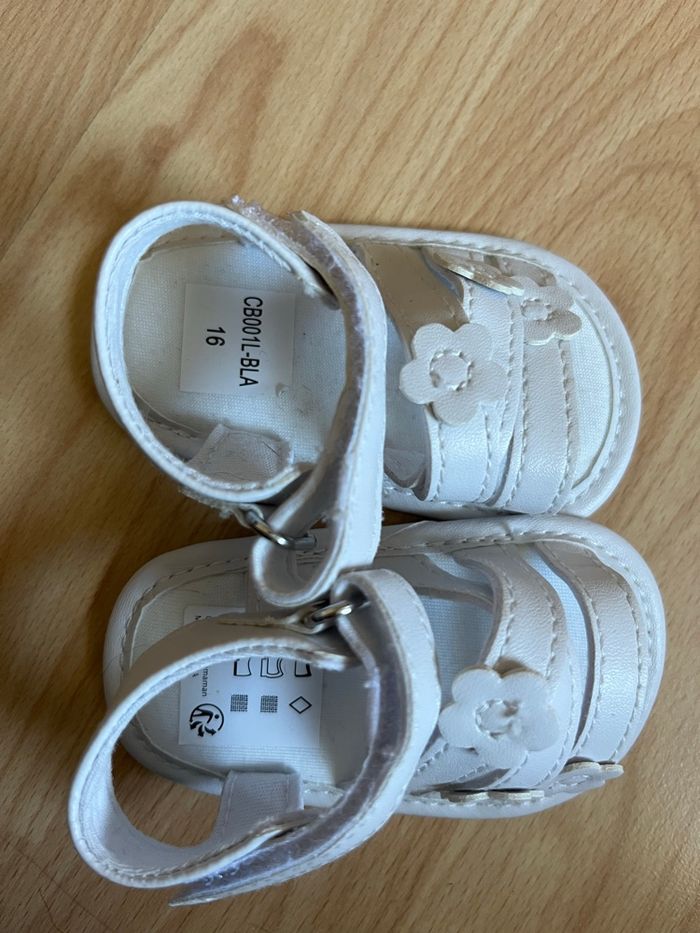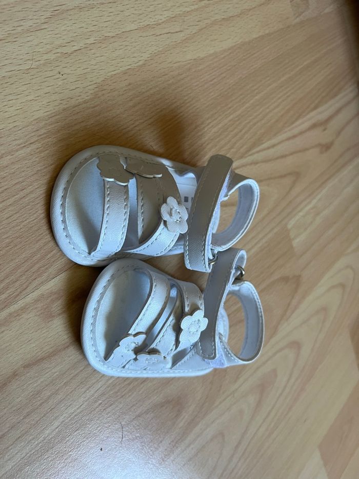 Sandalettes blanches décoratives pour bébé avec des petites fleurs sur les lanières Fermeture scratch Marque : orchestra prémaman Taille : 16 Très peu servies