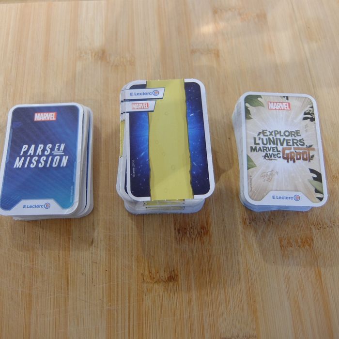 Cartes Marvel distribuées par Leclerc: - petit lot de 39 cartes 2022 Pars en Mission: 1€ le lot - gros lot 2023: 2€ le lot - gros lot 2024 Explore l'univers Marvel avec Groot: 2€ le lot