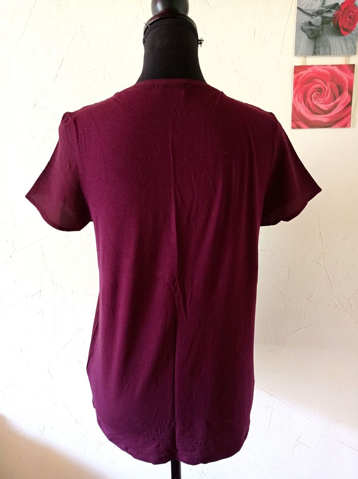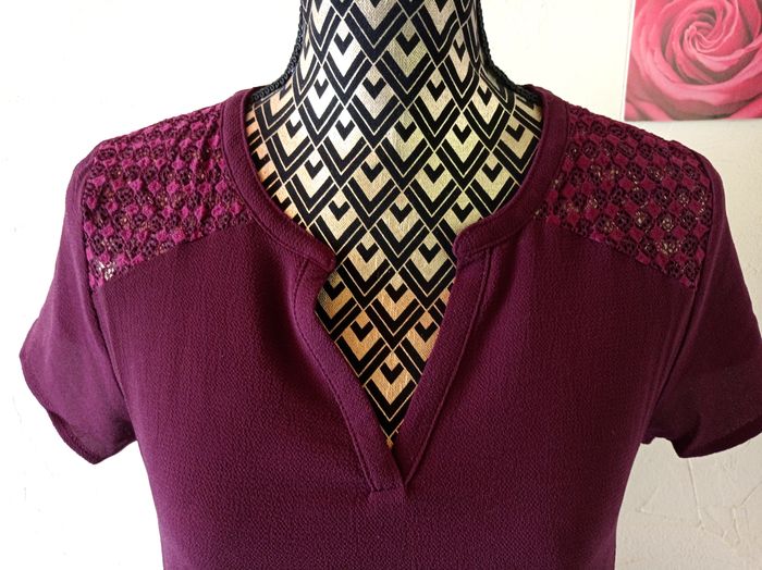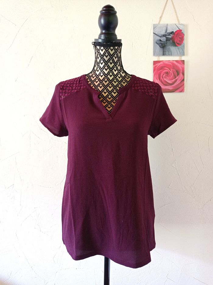 Jolie haut couleur lie de vin, fluide, dentelle sur les épaules. Très bon état. Largeur à plat d'une aisselle à l'autre : 46cm, longueur à partir du dessus de l'épaule : 62.5cm environ. #frip_femme38