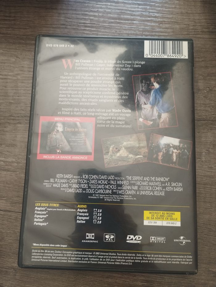 Réalisateur : Wes Craven Editeur : Universal Pictures Home Entertainment Parution : 03/01/2002 Nombre de DVD : 1 Classification : Fantastique - Horreur Acteurs : Cathy Tyson - Zakes Mokae - Paul Winfield - Brent Jennings - Conrad Roberts - Bill Pullman 044007864920 Audio : Français Anglais Espagnol Italien Portugais #DVD #L_Emprise_des_ténèbres #Horreur Envoi Rapide sous enveloppe bulles Tous mes produits sont vérifiés, restaurés si besoin et nettoyés avant d'être expédiés ❤️ N'oubliez pas de vous Abonné pour être averti pour chaque Nouvelle Annonce