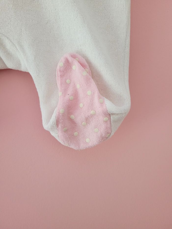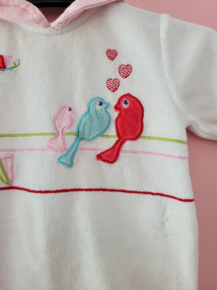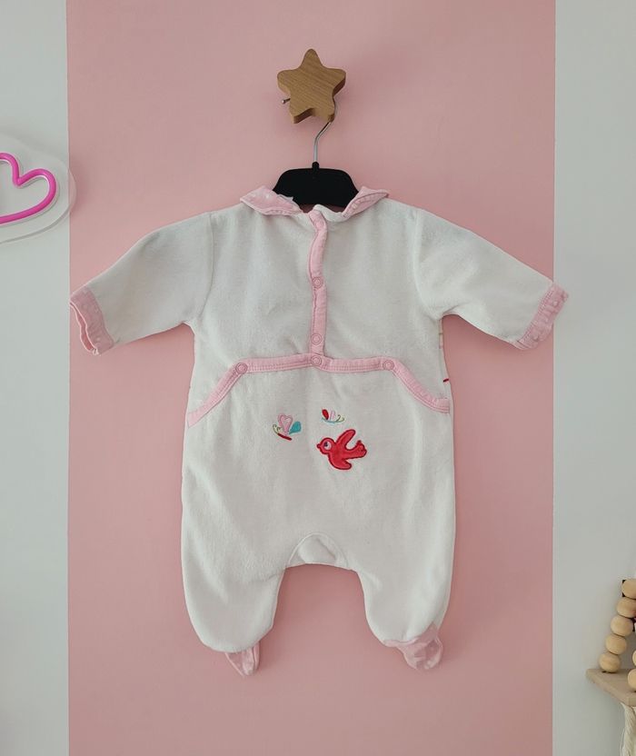 Pyjama en velours, de couleur blanc avec oiseaux, petit col rose a pois, de la marque Kitchoun, taille 1 mois (54 cm), en très bon état. Article lavé pour la vente.