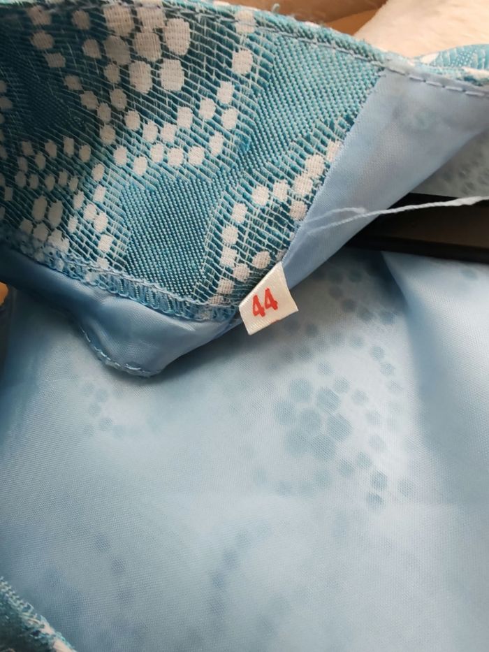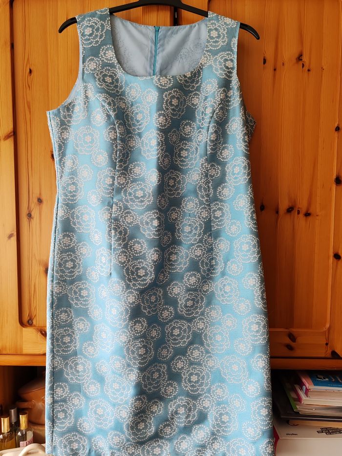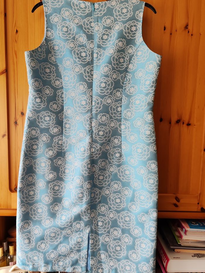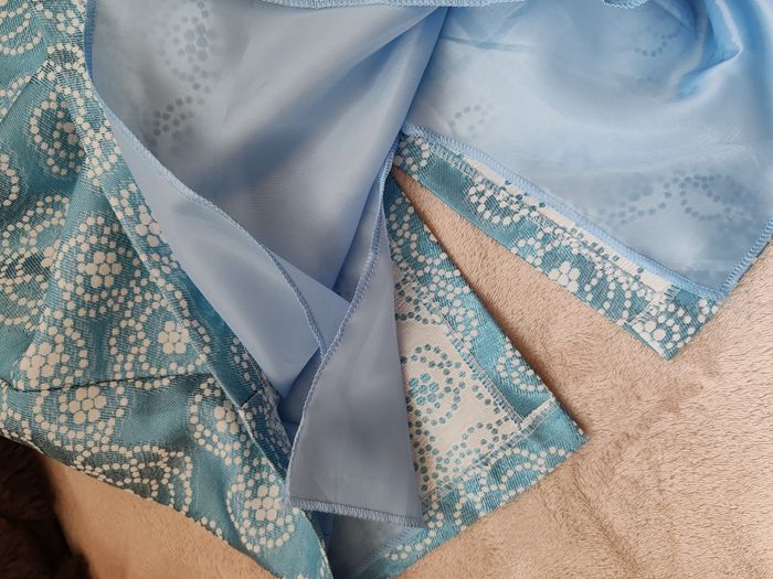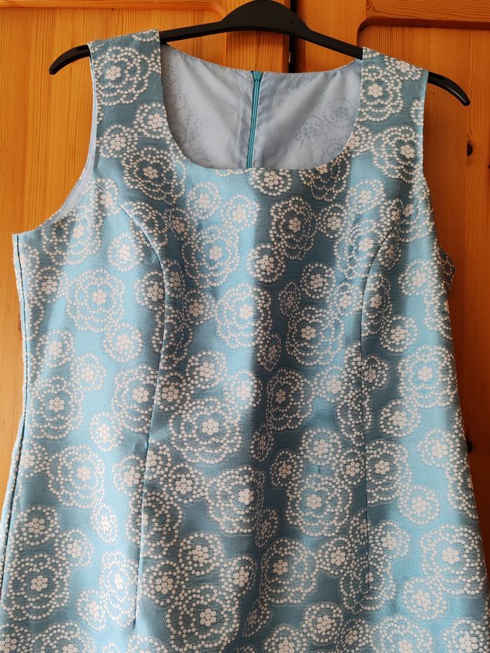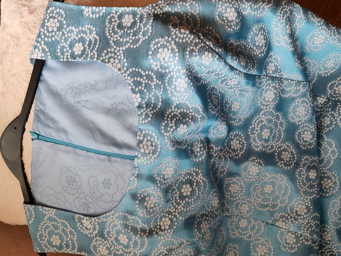 robe de cérémonie bleu ciel aux motifs géométriques délicats brillants, sans manches, Col rond, Motifs géométriques, Fermeture éclair au dos Fente aisance au dos. Entièrement doublée.