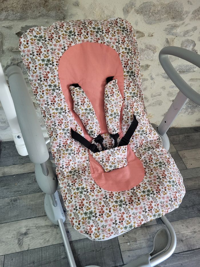Housse qui s'ajoute à l'assise d'origine du transat up and down de béaba . Imprimé liberty/ corail Accessoires sangles et entre jambe assortis. Lavable en machine à 30° Page fb Zol&Saan confections Insta zolsaan.