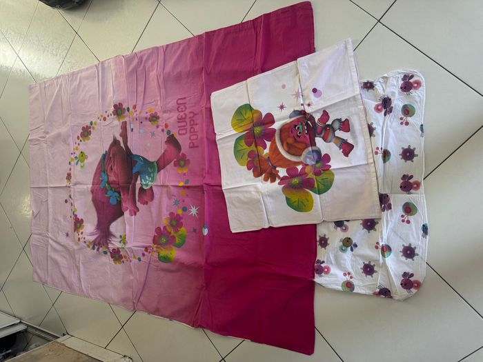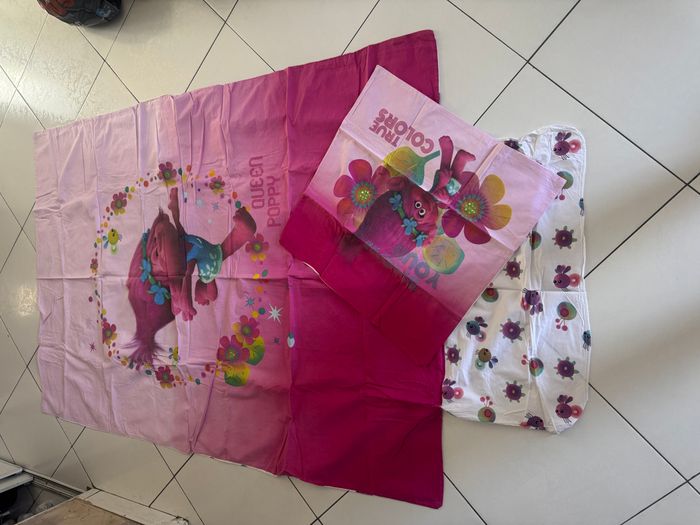 Je vends cette housse de couette Trolls de couleur rose avec son taie d'oreiller assortie. - Type de produit : Linge de lit - Composition du lot : 1 housse de couette, 1 taie d'oreiller - Couleur : Rose - Matière : Coton - Dimensions : 90 x 190 cm Très bon état N'hésitez pas à me contacter pour plus d'informations. #elviiraaa788 #elviiraaadrap