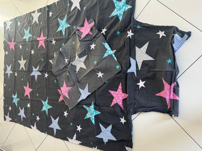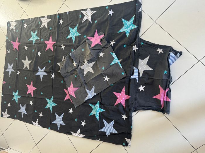 Je vends cette housse de couette avec une taie d'oreiller assortie, parfaite pour une chambre d'enfant. - Type de produit : Housse de couette + 1 taie d'oreiller - Couleur : Noir avec motifs étoiles multicolores - Matière : 100% coton - Dimensions : 90 x 190 cm Très bon état N'hésitez pas à me contacter pour plus d'informations. #elviiraaa788 #elviiraaadrap
