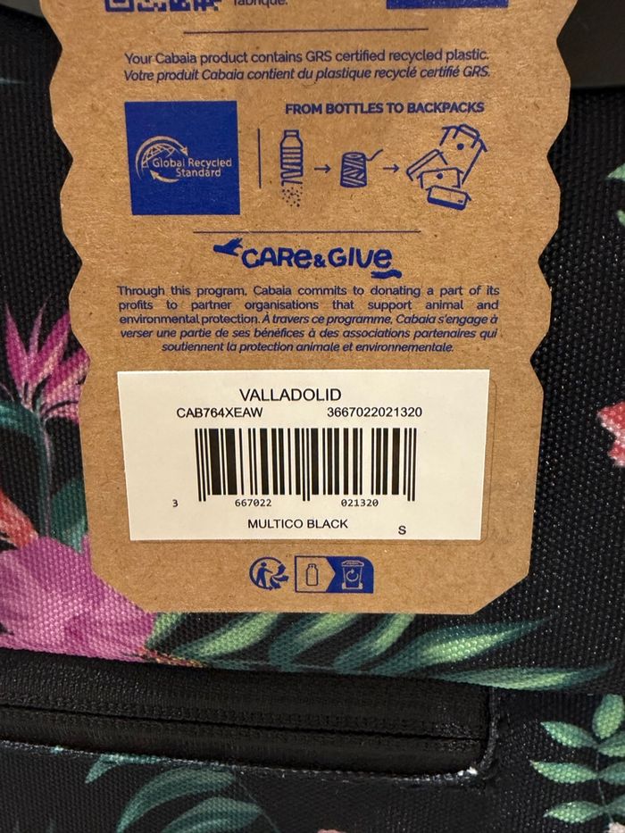 Modèle valladolid Best seller Déballer juste pour les photos Neuve avec étiquette et carton d’origine Stable et maniable Dimensions (38L) : 21 cm x 35 cm x 55 cm Poids : 2,4 kg Garantie à vie Serrure TSA intégrée pour une sécurité renforcée Accès direct par le haut : accès rapide à vos affaires Grande poche avant Poche secrète au dos Poche gourde extérieure 1 poignée haute et 2 poignées latérales Système MOLLE pour attacher la pochette avant Vegan et déperlante Voir profil autre chose de la marque cabaia