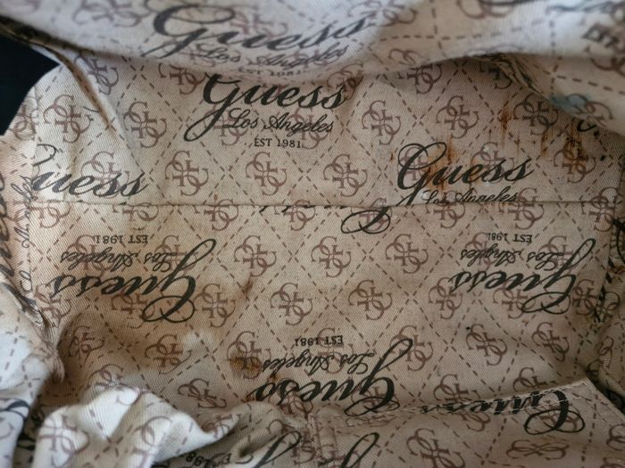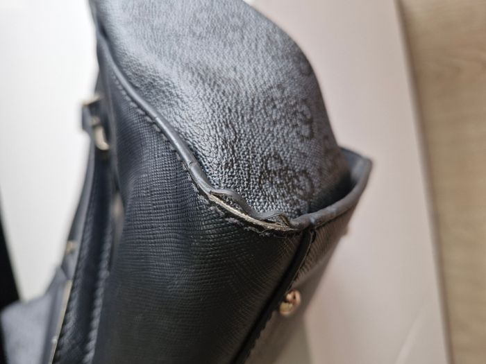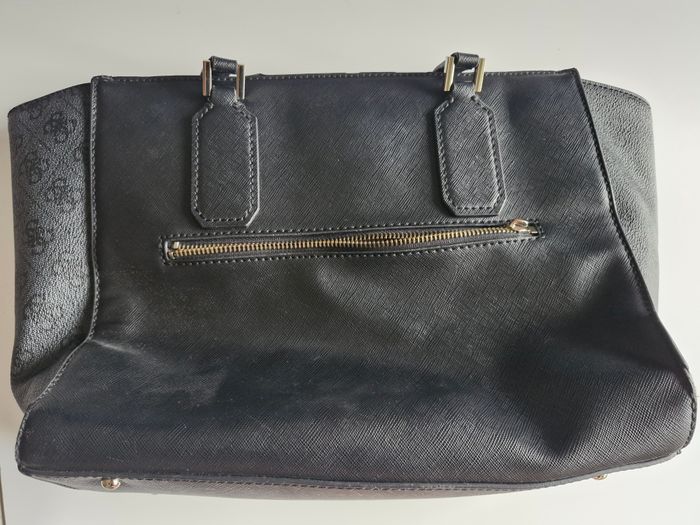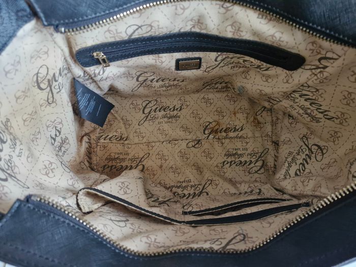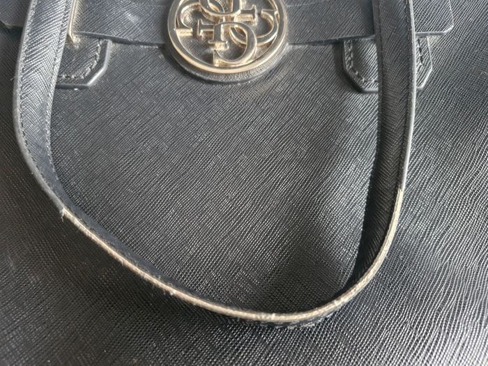 Sac à main noir de marque Guess Prix négociable Grand compartiment avec fermeture éclair + 1 petite poche avec fermeture éclair à l'intérieur + 3 petits compartiments de rangement Matières : - extérieur en PVC - intérieur en polyster (80%) et coton (20%) Présente plusieurs traces d'usure au niveau des anses et des coins du sac + taches au fond du sac + manque la tirette d'une fermeture éclair