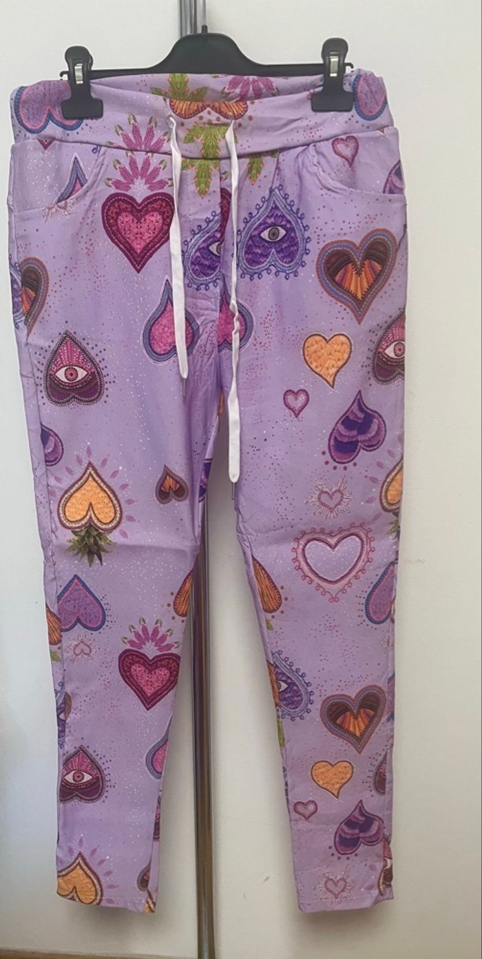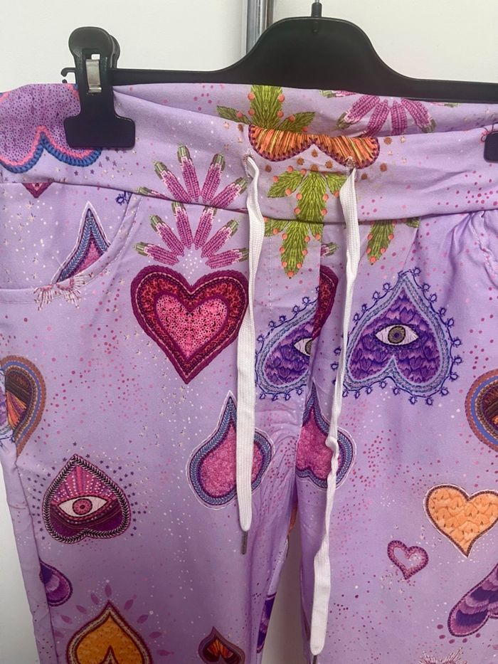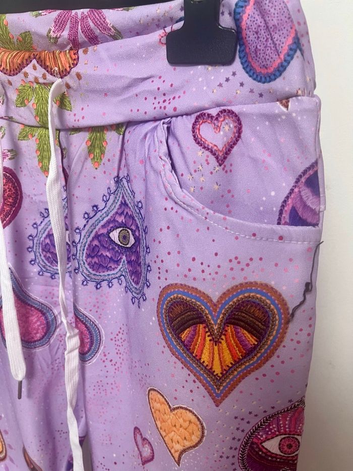 Pantalon de couleur mauve avec motifs Taille unique et élastique à la taille et cordon Marque made in italy Neuf sans étiquette