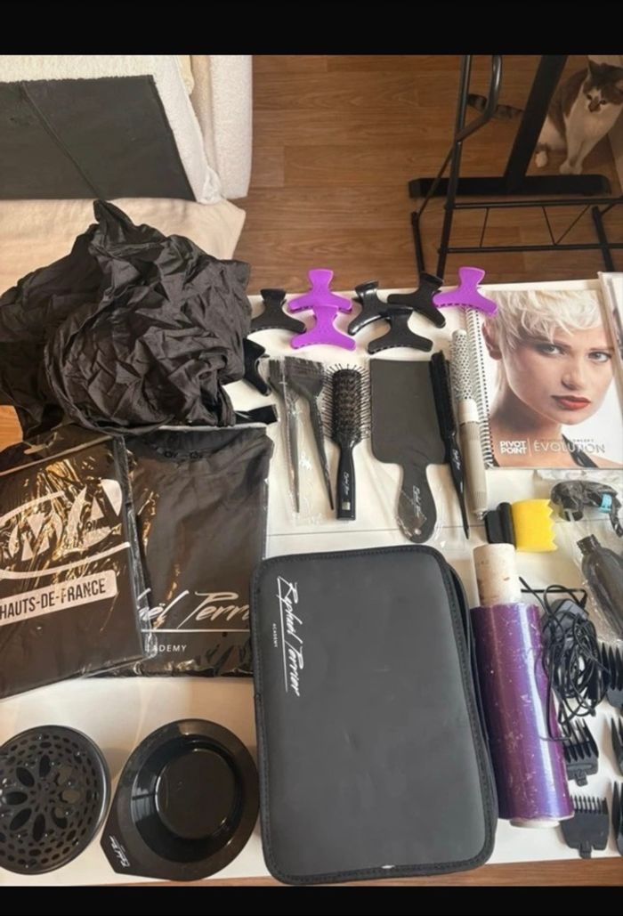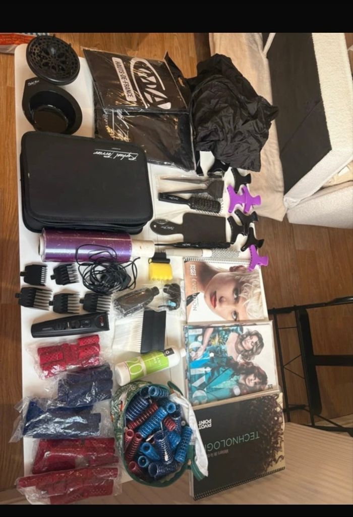 Bonjour, je mets en vente plein d’accessoires de coiffure en lots y’a des choses neuve si vous est intéressé pour une seule choses dites-moi -bol couleur - diffuseur -pochette Raphaël Perrier de rangement -cellophane prédécoupé qui n’a jamais été utilisé -Tondeuse Babyliss, F X3, utilisée pendant un an et demi mais j’ai changé donc je la vends. -pinceau couleurs lot de deux -palette -brosse ronde - 8 pince -2 peignoir -1 tablier -grosse araignée -brosse pour plaquer -3 livres de coiffure, jamais utilisé pivot point -éponge permanente -balai à cou -Occident, crème 20 volume coiffée jamais ouvert -vaporisateur, neuve -bigoudis pour mise en plis, cinq sachets et une trousse avec beaucoup de bigoudis -plus de 100 bigoudis pour permanente -rasoir