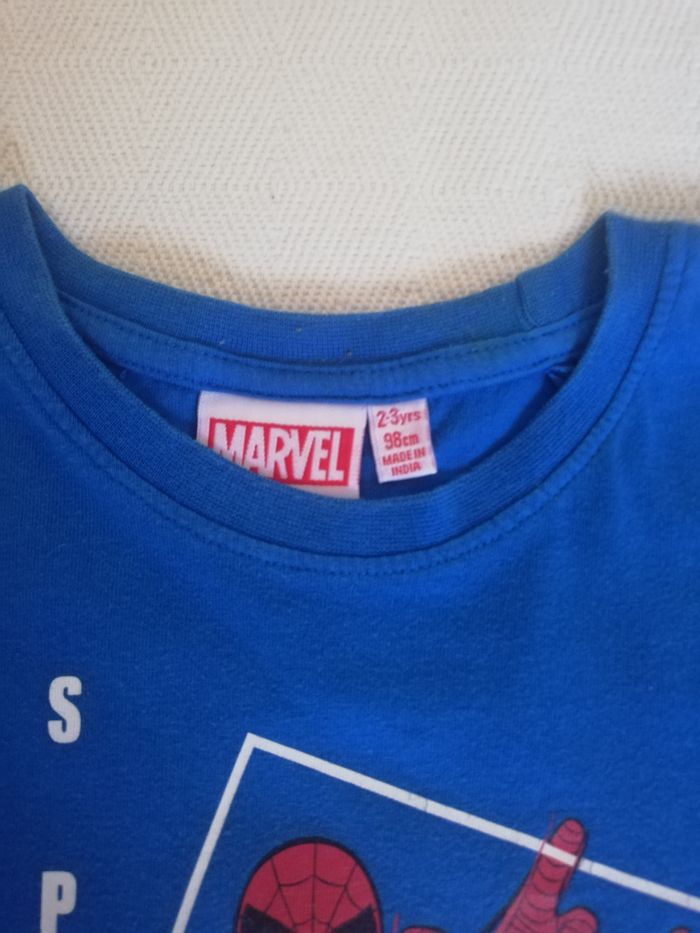 Vends ce t-shirt bleu à manches courtes, 100% Coton de la marque MARVEL avec SPIDERMAN sur le devant. Impression impeccable. Pour petit garçon de 2 à 3 ans En très bon état : pas décousu, pas d'accroc, pas de tâche.