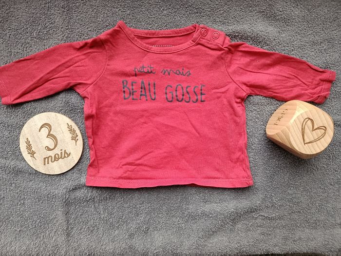 Lot de 2 tee shirts manches longues en taille 3 mois (60 cm) de la marque NPO (districenter). Couleur: bleu et bordeaux avec écrit : petit mais beau gosse. Idéal pour des jumeaux.
