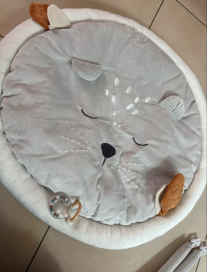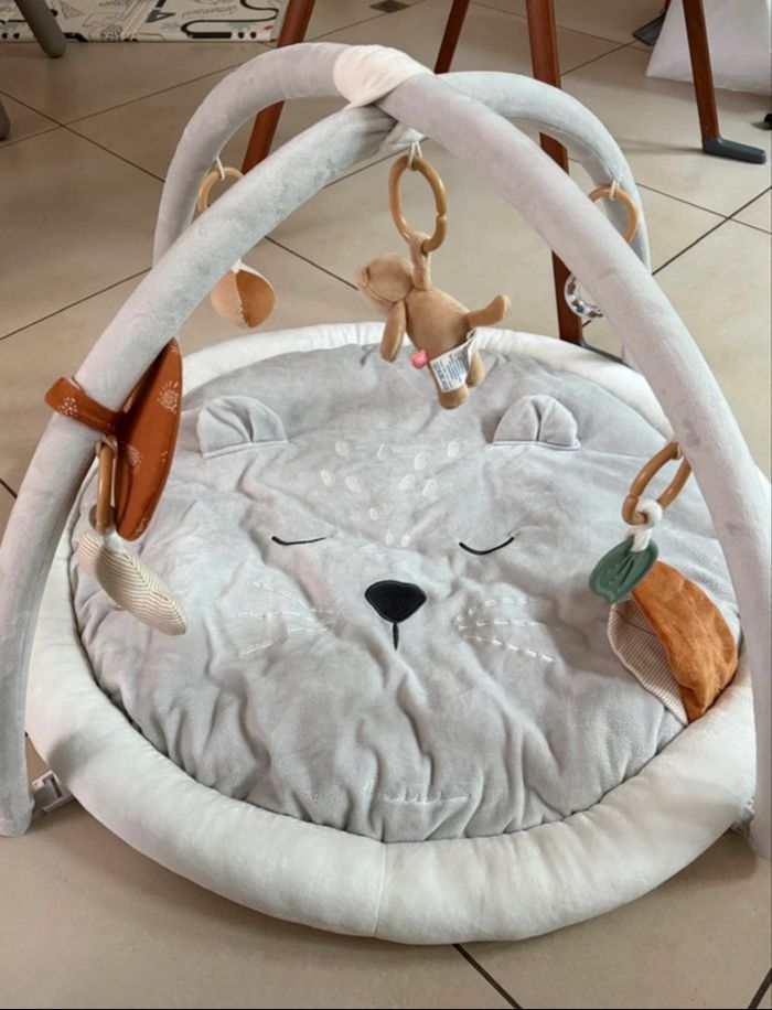Tapis d’éveil Noukies en parfait état avec housse de rangement. L’arche s’enlève pour se transformer en tapis simple. Très pratique lors des déplacements en vacances !